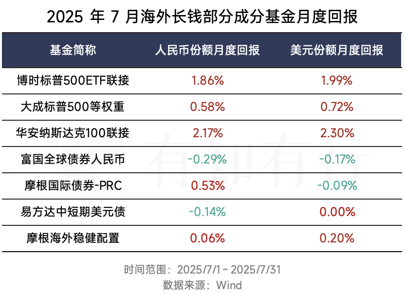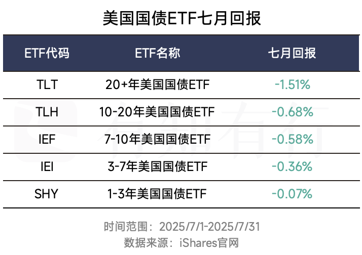 债市方面,七月美债略微下跌。美国十年期国债收益率从月初的 4.24%,抬升至月末的 4.36%。下图展示了不同久期的美国国债 ETF 在七月的表现,其中长债跌幅较大,短债跌幅较小。海外长钱配置的海外债基金的组合久期大多集中在 4 年以下,最高不超过 7 年,受债市下跌影响较小。