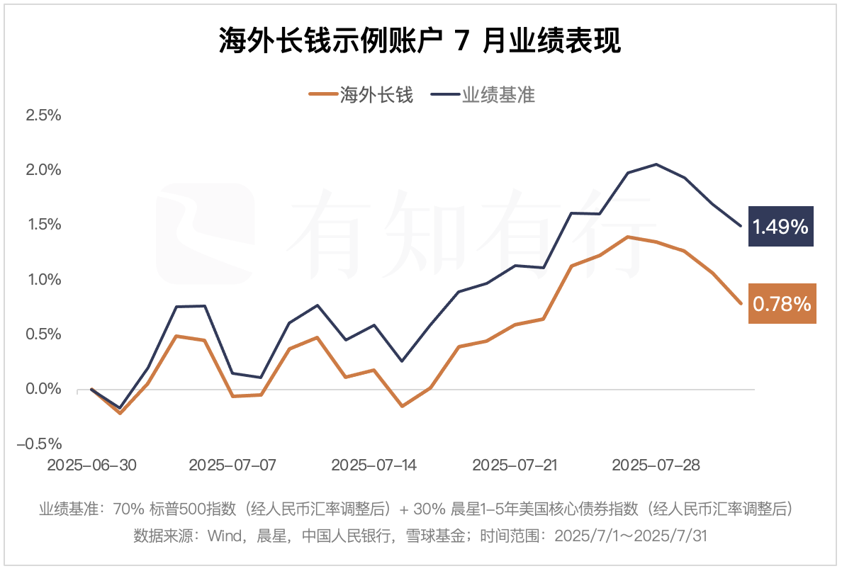 在综合因素影响下,七月海外长钱示例账户扣费后收益率为 0.78%,同期业绩基准收益率为 1.49%。海外长钱示例账户本月落后基准,主要原因是股票部分落后。七月,美股表现较优且美元指数走强,日股和欧股在汇率部分就落后了美股 2%-3%,综合表现不如标普500指数