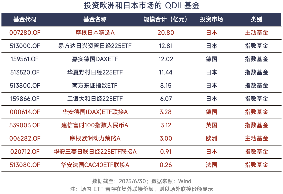 下图来自海外长钱 2025 年半年报,展示了目前市面上所有投资欧洲和日本的 QDII 基金,其中标红的是海外长钱能够配置的场外基金。可以发现选择并不多,大部分符合要求的基金都已经被海外长钱纳入组合了。