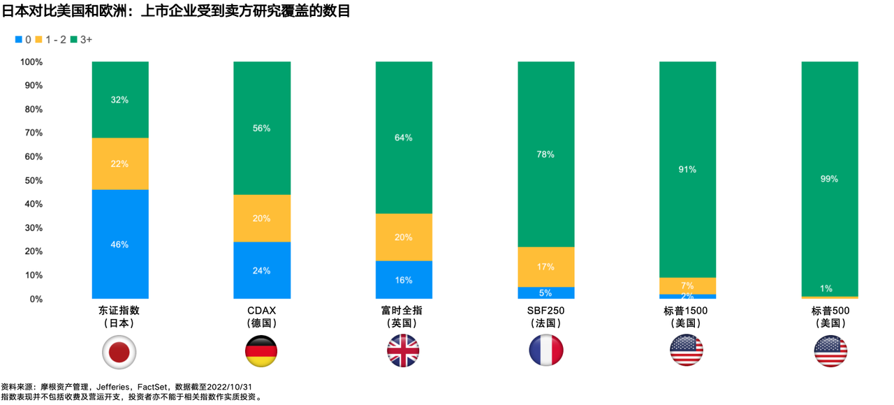 下图展示了不同国家指数里,研究员覆盖的上市企业数目。当一个公司的股票被多个研究员覆盖时,就意味着关于该股票的信息在市场上被充分沟通,要在该股票上获取超额收益就比较困难。美国市场的专业覆盖度大于欧洲远远大于日本,所以在美国市场首选指数基金,而日本市场则可能存在一定超额收益的空间。