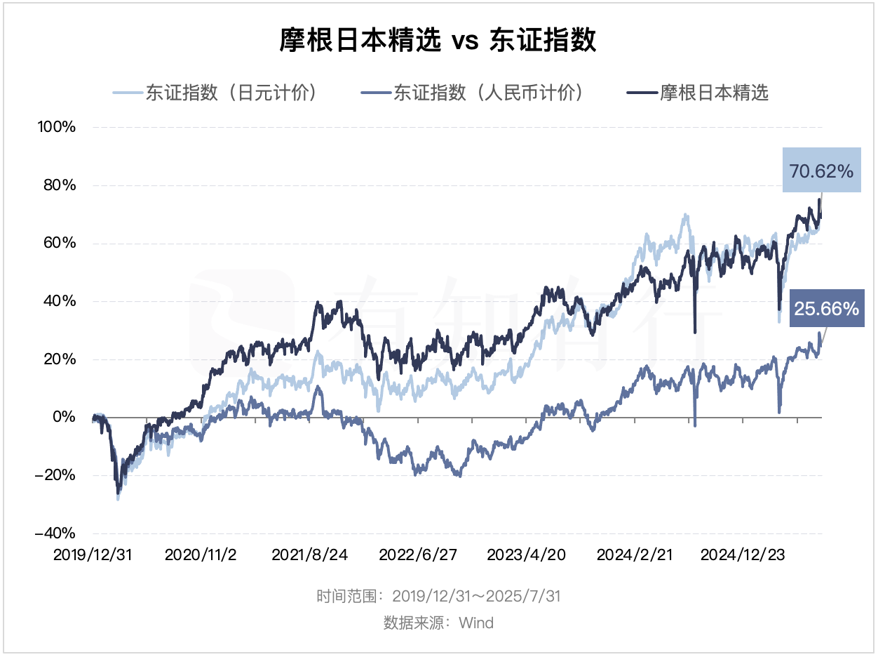 以日本为例,虽然日本股市是一个发达市场,股票波动率并不高。但作为海外投资者来说,它的汇率风险是很难忽视的。下图展示了摩根日本精选与其基准东证指数的走势对比图,最下面的曲线代表了用人民币投资东证指数的收益率。可以发现,过去 5 年里,用日元投资东证指数的收益率比用人民币投资东证指数的收益率高了不少,这主要是因为日元汇率相对人民币在这几年内有较大幅度的贬值。作为海外投资者来说,这几年日股上涨的收益被汇率吞掉了不少