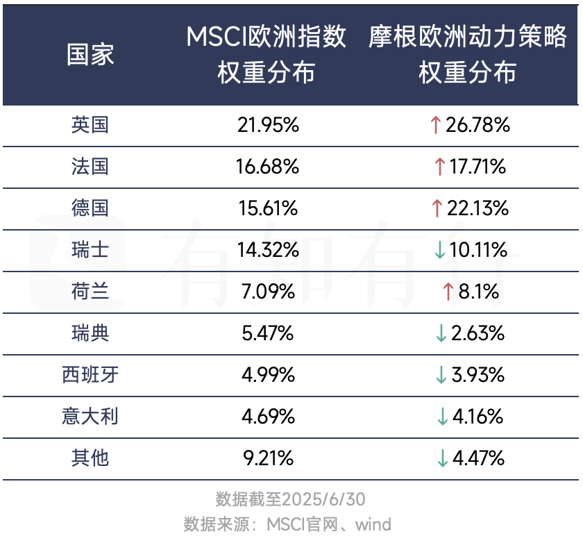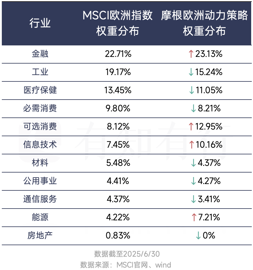下图展示了 MSCI 欧洲指数和摩根欧洲动力策略的国家、行业的权重分布,MSCI 欧洲指数是摩根欧洲动力策略的业绩基准。可以发现,该基金的国家和行业分布与业绩基准基本类似,只是做出了比例上的调整。这样的思路有点类似国内指数增强基金的做法,不少海外基金的管理思路是这样的。