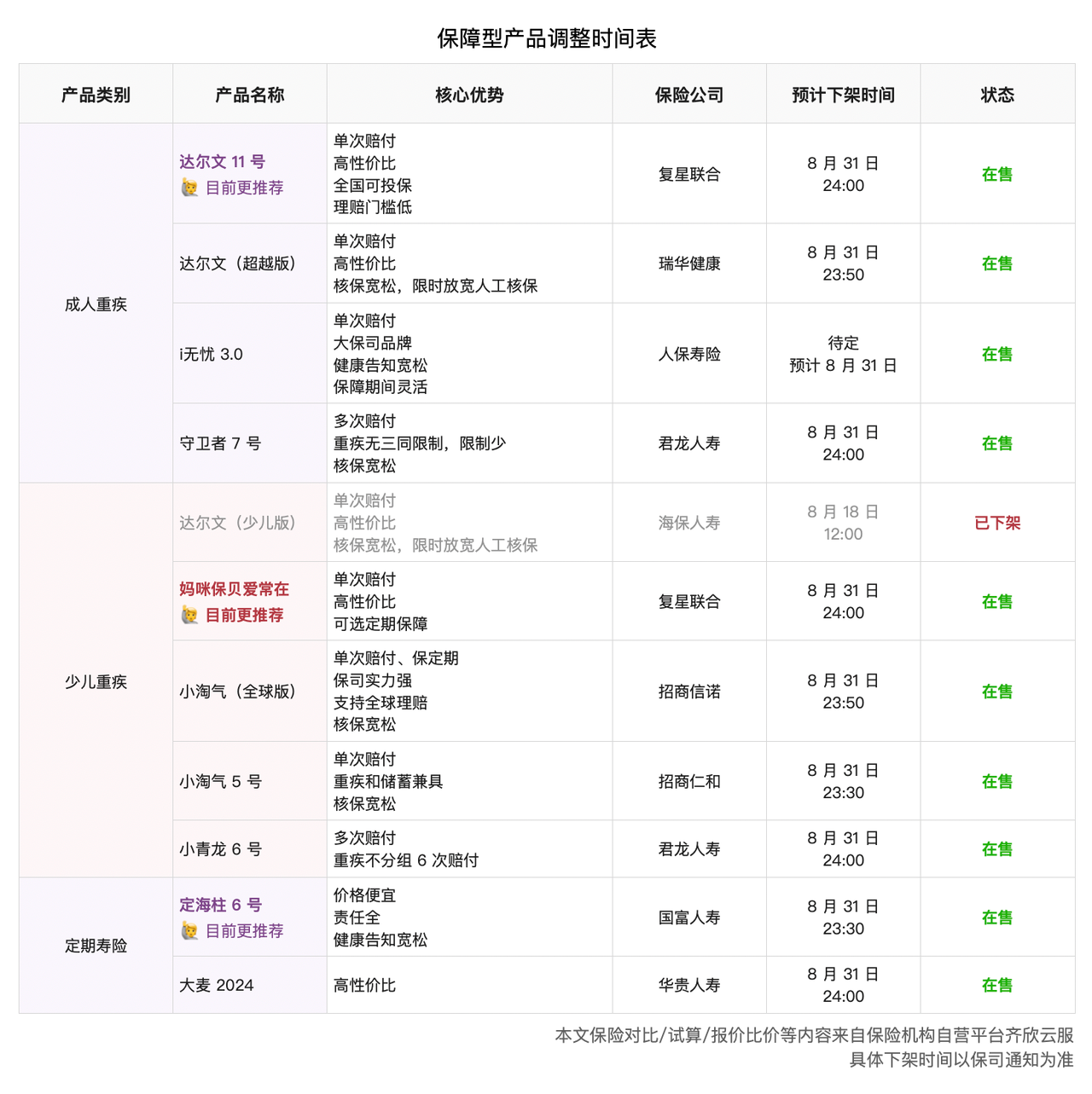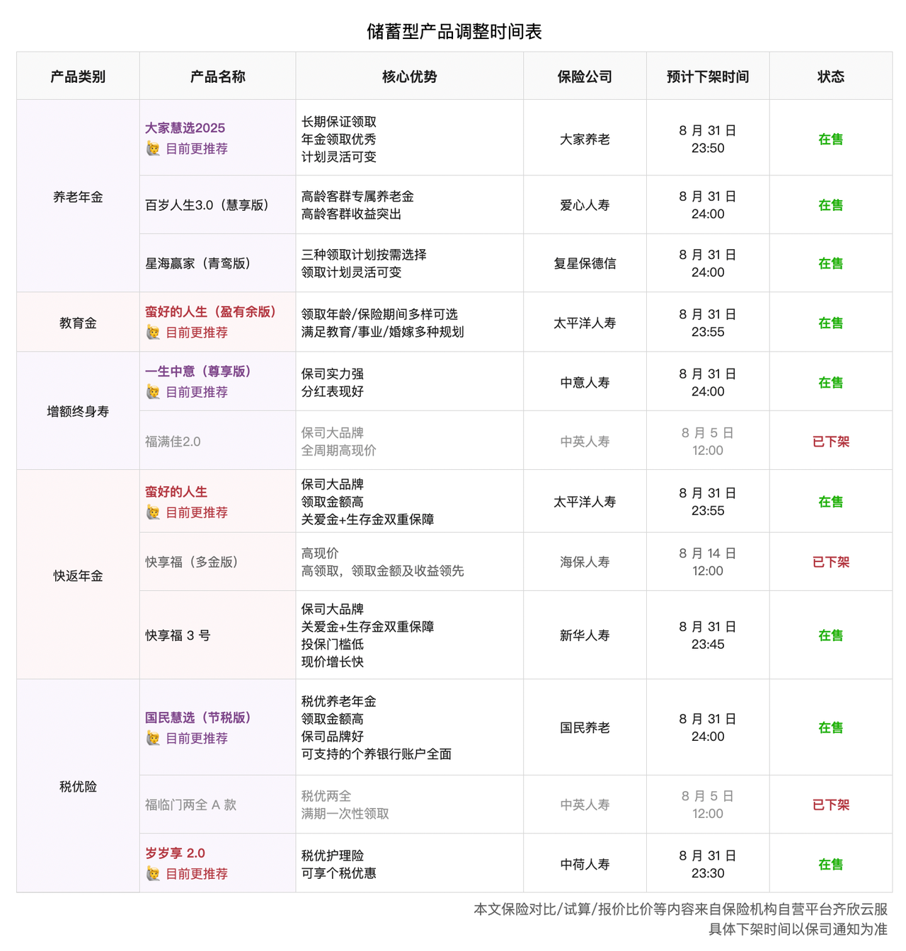 同时,我们也整理了保障型和储蓄型两类受影响的产品清单,并标注了它们的预计调整时间。后续将根据最新信息及时更新。若有投保计划,建议提前留出时间,优先关注重疾险、定期寿险、储蓄险等受影响险种,避免错过合适时机。