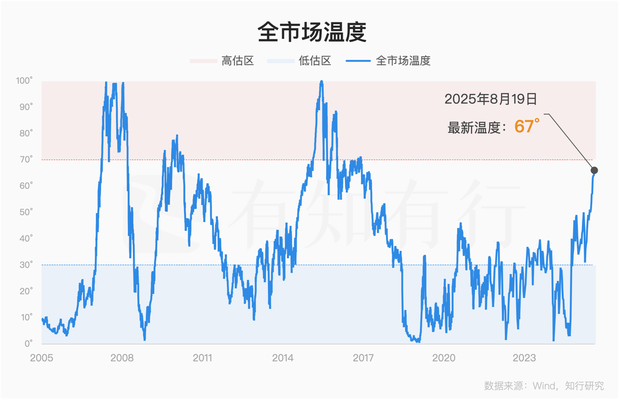 如何在高弹性的卫星资产上,进一步降低风险、增厚收益呢?长钱账户选择进行大周期的低买高卖操作。下图展示了长钱账户推出以来,全指信息的指数走势和温度变化情况。