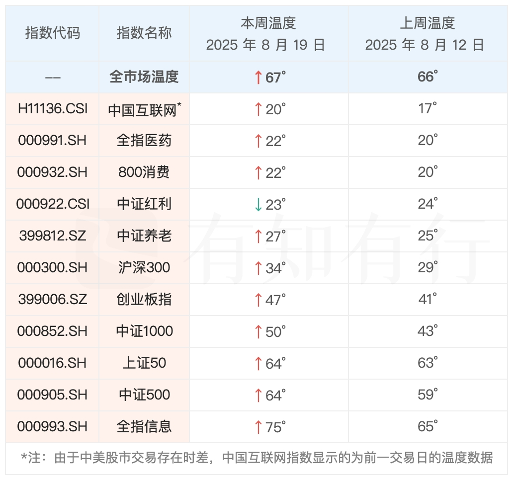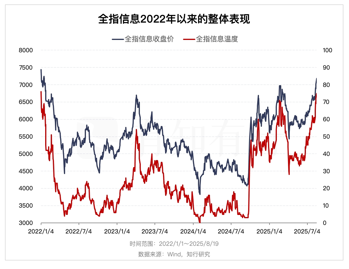 创业板指和全指信息的指数温度提升很快,全指信息最新温度来到了 75°,成为我们关注的指数里,第一个进入高估区间的品种。