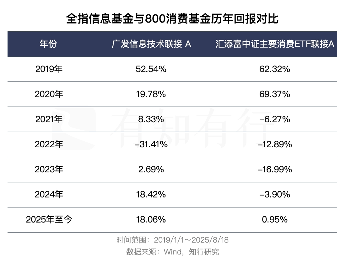 下图展示了全指信息基金与800消费基金从 2019 年至今,每一年的回报对比情况。能明显看出,全指信息基金经历了2019 年、2020 年的大幅上涨后,开始转为下跌,尤其是 2022 年的跌幅很大,之后开始慢慢企稳上涨,尤其是 2024 年和 2025 年涨幅明显。相对应的是,800消费基金在 2019 年和 2020 年涨幅大幅高于全指信息基金,之后开始缓慢下跌,一直到现在,都没有明显企稳上涨的态势。