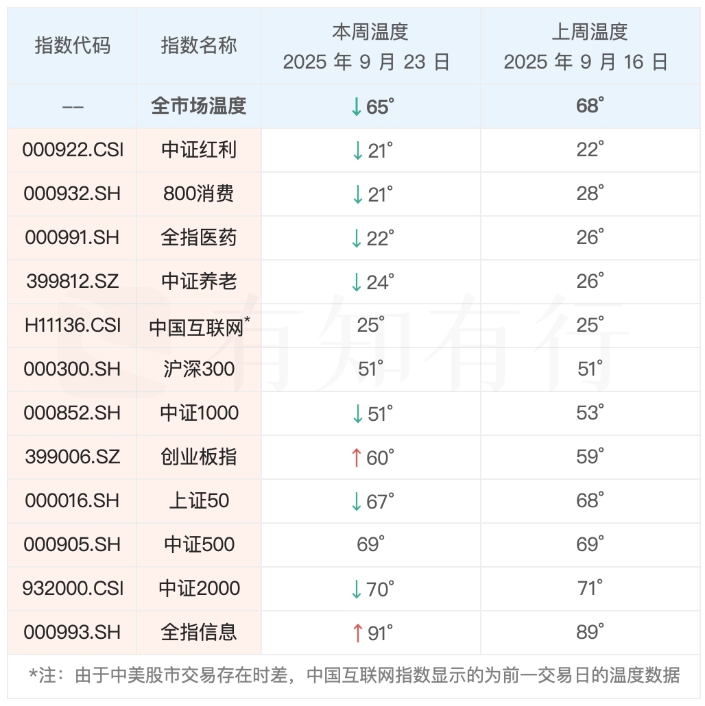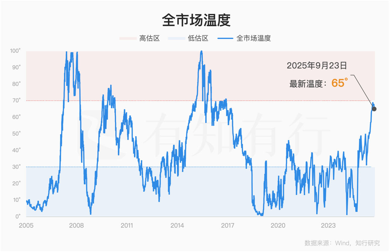 先来看最近一周的股市情况,最近一周A股整体回调,中证全指下跌 0.84%,大多数行业和个股都出现了下跌。受此影响,我们最新的全市场温度回落到 65°。 下图中我们将 70° 以上划分为高估区域,市场近期在 60° 到 70° 之间反复徘徊,难以突破。让我想起前两年,市场在底部时,30° 这个位置也是很难突破。为此,我们还画过一张图,来自 30° 的凝视。不知不觉中,市场开始挑战 70° 了。