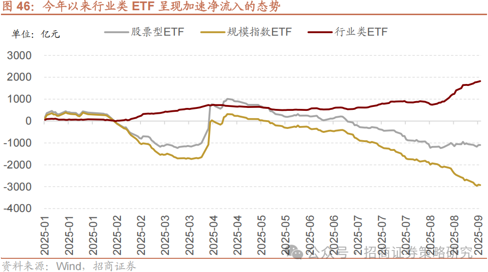 在具体持仓偏好上,个股我们不展开讨论,我们通过 ETF 的资金流入流出情况,能够看出今年结构性行情的演绎情况。今年股票型 ETF 中, 呈现规模指数 ETF 持续流出、行业主题类 ETF 加速流入的格局。下面这张图展示了今年不同类型 ETF 的资金净流入情况。