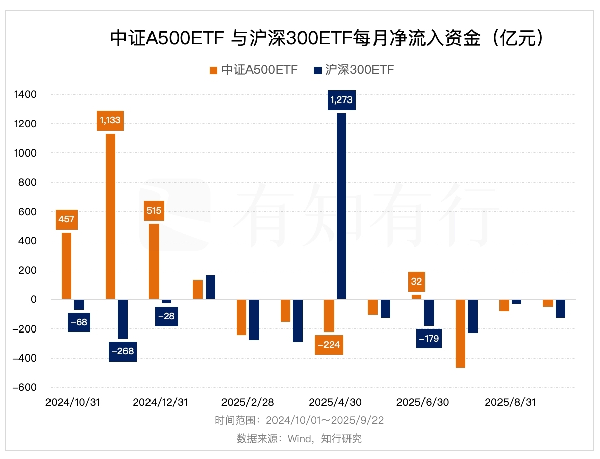 上面这张图是跟踪中证A500的所有 ETF 和跟踪沪深300的所有 ETF,最近一年每个月净流入资金的情况。这两类 ETF 在规模指数 ETF 中很具有代表性,并且这两类 ETF 今年的变动对规模指数 ETF 的影响也很大。