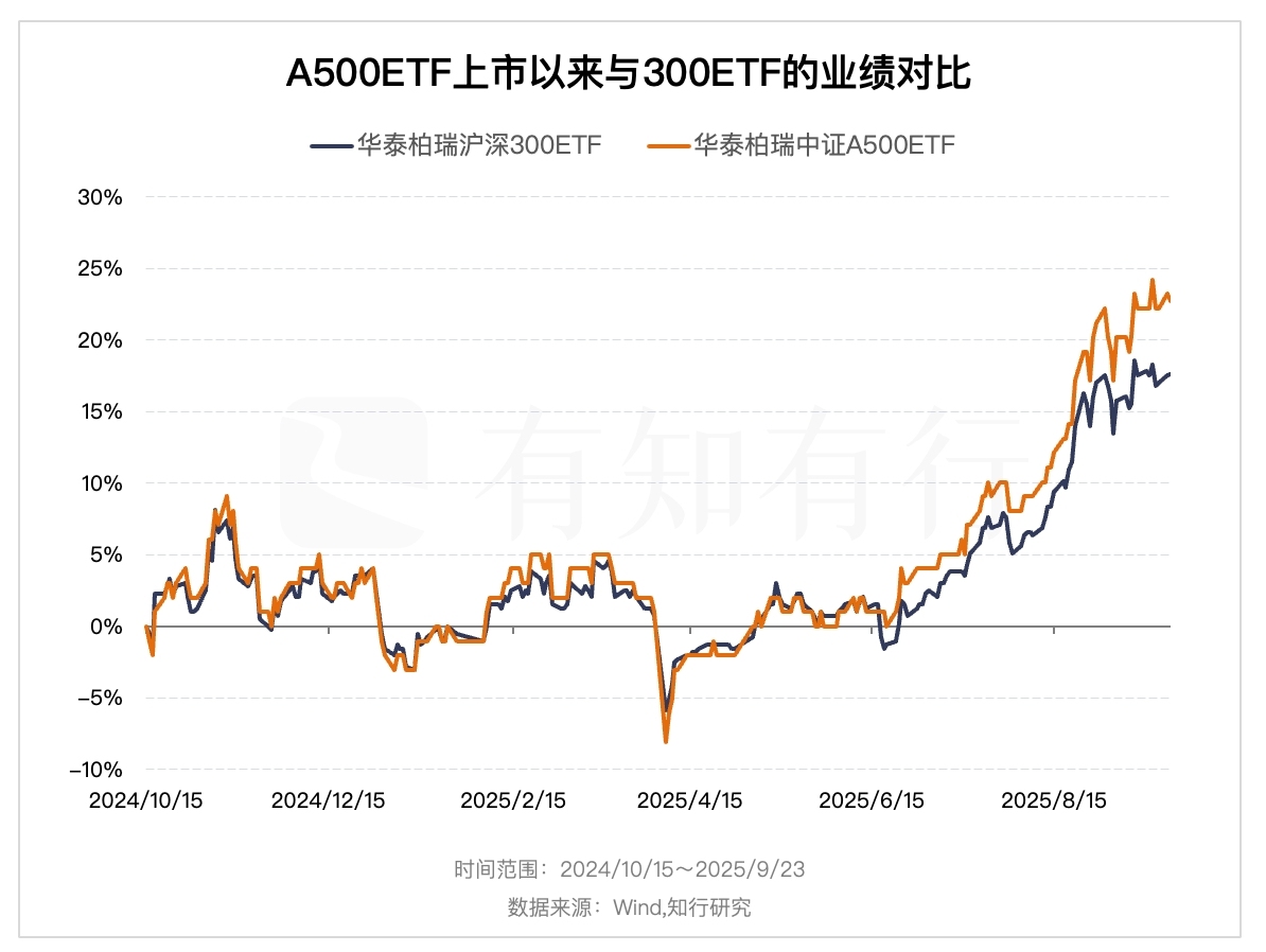 我们挑选了规模最大的两只 ETF 来进行说明。从去年 10 月 15 日 华泰柏瑞中证A500ETF上市至今,它与华泰柏瑞沪深300ETF的走势是很接近的,从今年 7 月开始,中证A500ETF涨幅更快一些,整体表现会好于沪深300ETF。