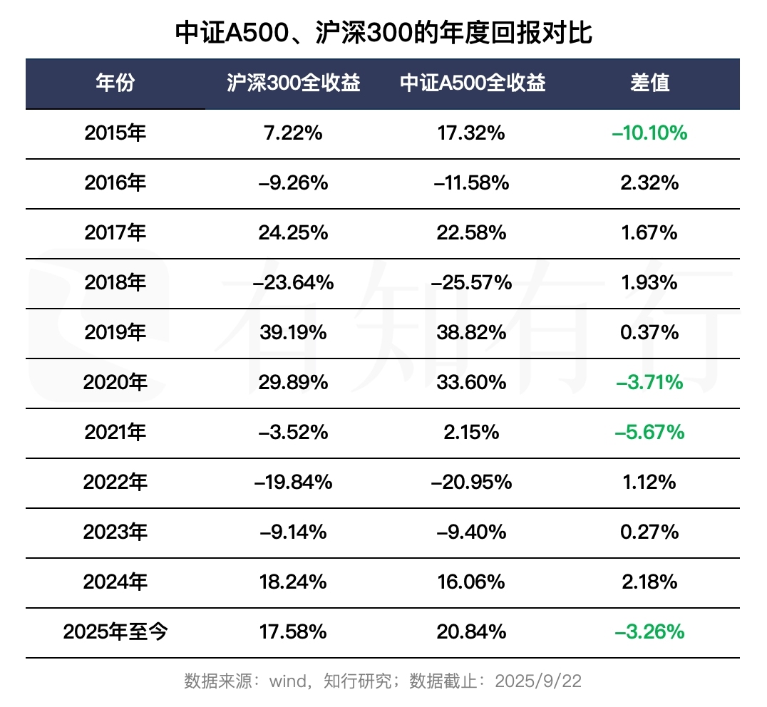 其实,不仅今年,这种行业配置思路的不同,导致沪深300与中证A500在每一年的表现都会有差异。下图展示了二者年度回报的对比情况。有的年度中证A500获胜,有的年度沪深300则跑赢,这取决于当年具体行业的表现如何。