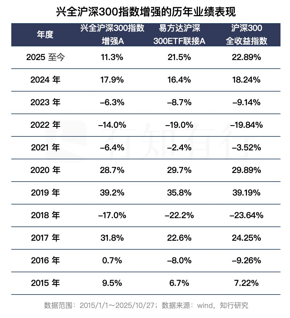 兴全沪深300指数增强,是市场上运作时间很长、规模很大、很有代表性的一只沪深300指数增强基金。我们把该基金 2015 年到现在每年的业绩表现,与被动投资沪深300的普通指数基金「易方达沪深300ETF联接A」,以及沪深300全收益指数放在一起对比,具体可见下图。