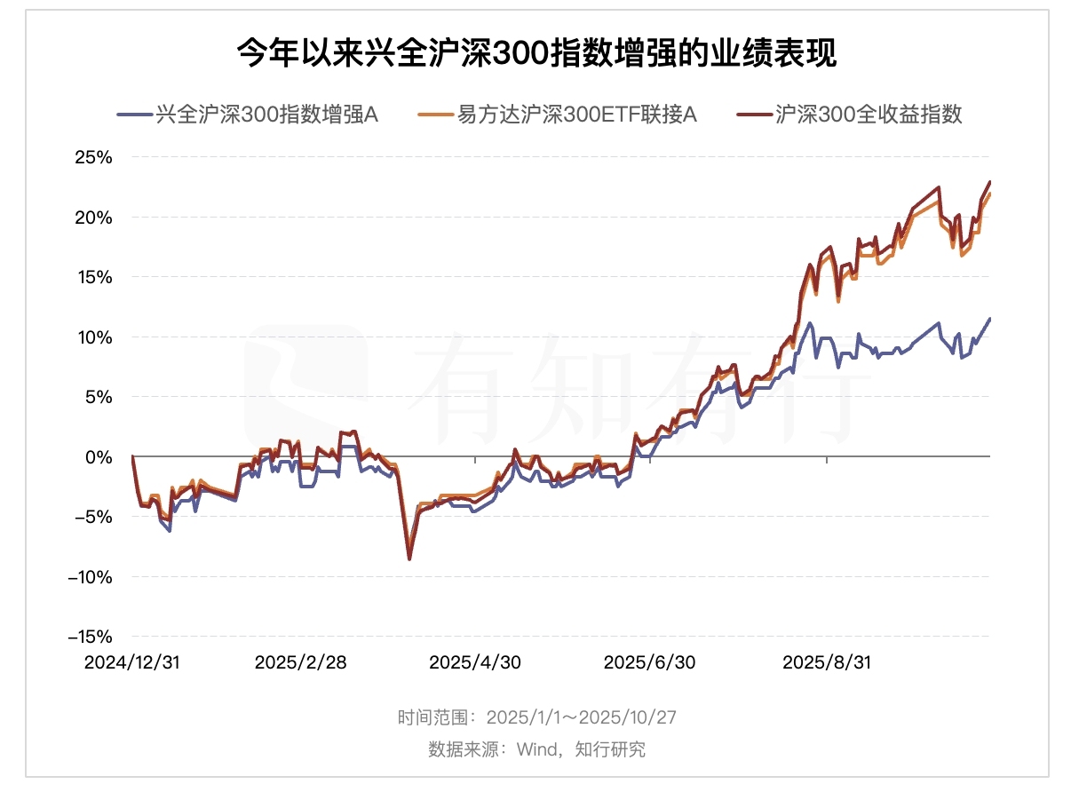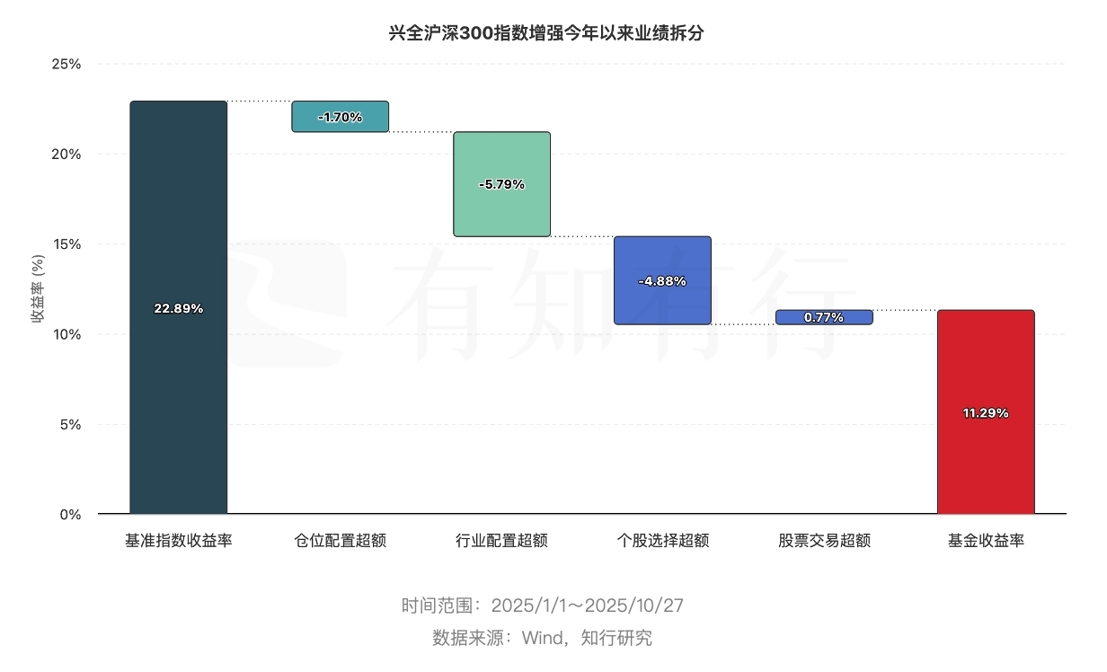长期来看,兴全沪深300指数增强基金创造了超额收益。从上图每年的业绩对比来看,在今年之前,该基金整体表现很稳健,多数年份是跑赢「易方达沪深300ETF联接A」,即便有跑输的时候,跑输的差值也较小。但 2025 年至今,该基金的表现大幅落后指数以及对应的指数基金