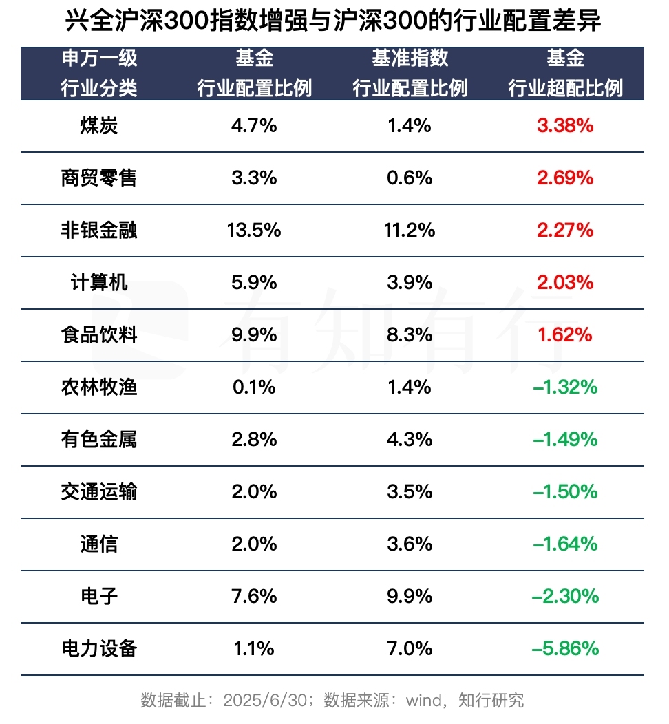 下图展示了今年 6 月底,兴全沪深300指数增强基金相比于沪深300来说,配置比例差异较大的行业。例如,相比于沪深300,该基金超配了煤炭、商贸零售、非银金融、计算机和食品饮料;低配了电力设备、电子、通信、交通运输、有色金属、农林牧渔等行业。
