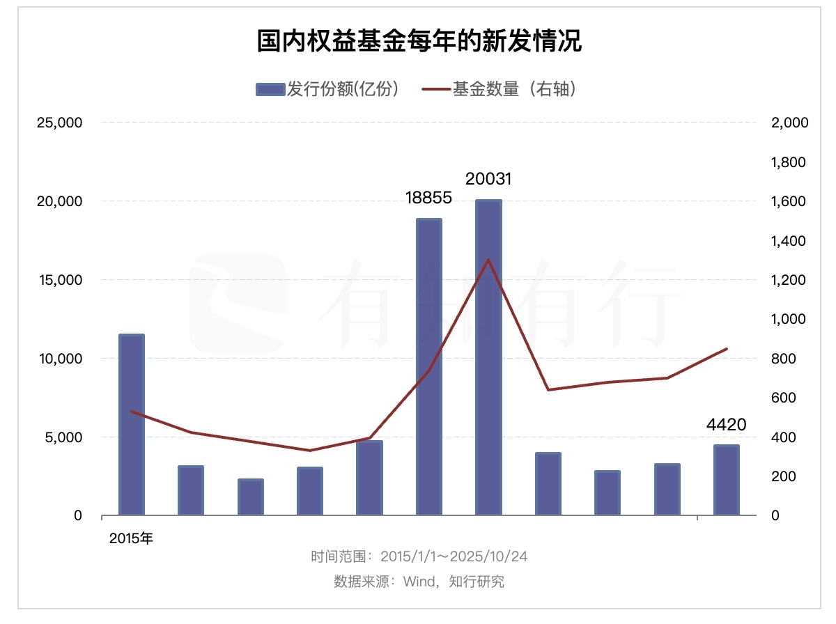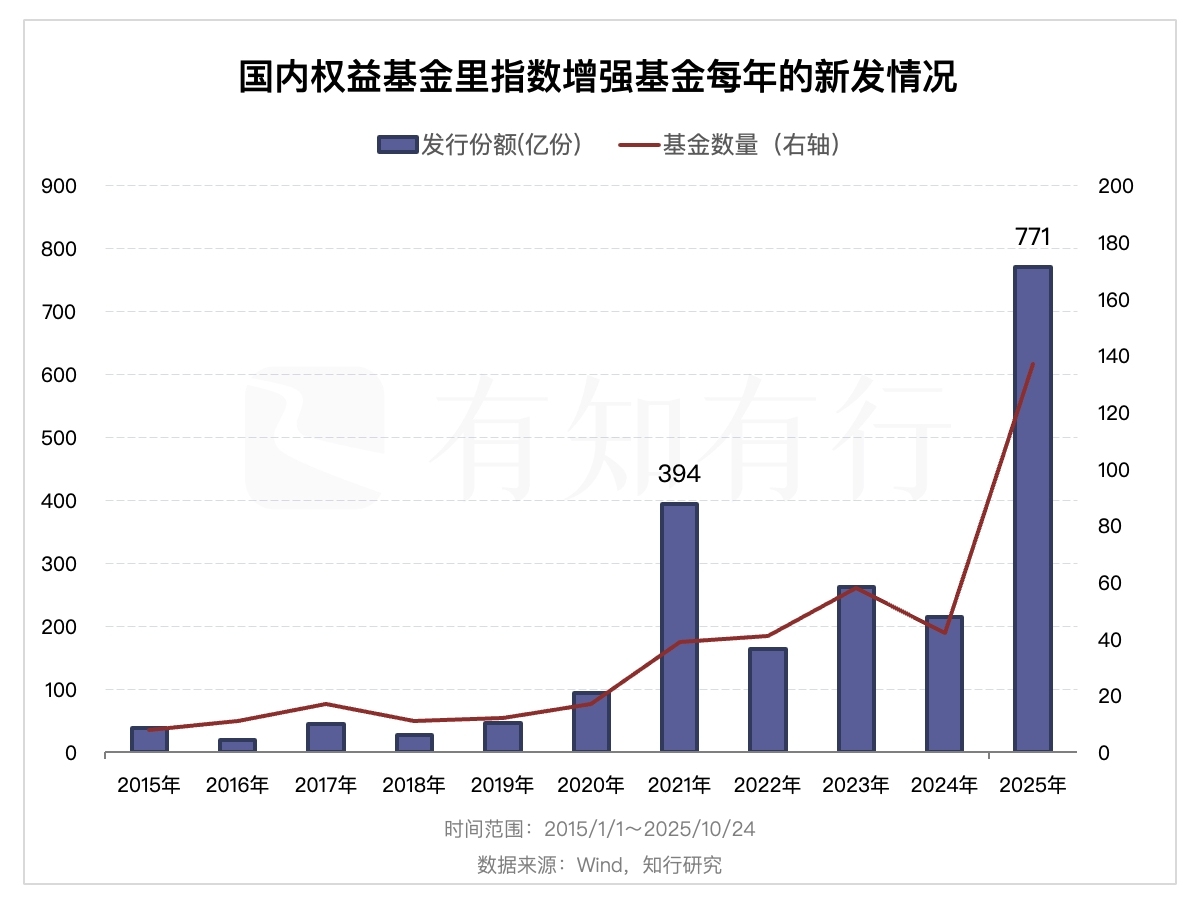 今年以来,指数增强基金相比于往年,迎来了快速增长,无论是新发产品数量还是发行规模都创下了历史新高。这背后是政策引导、市场环境、投资者需求以及公募相关机构战略布局等多重因素共同作用的结果。我们把指数增强基金和所有国内权益基金每年的新发数据放在下面两张图里了,大家对比一下,就能看到指数增强基金今年的扩充。