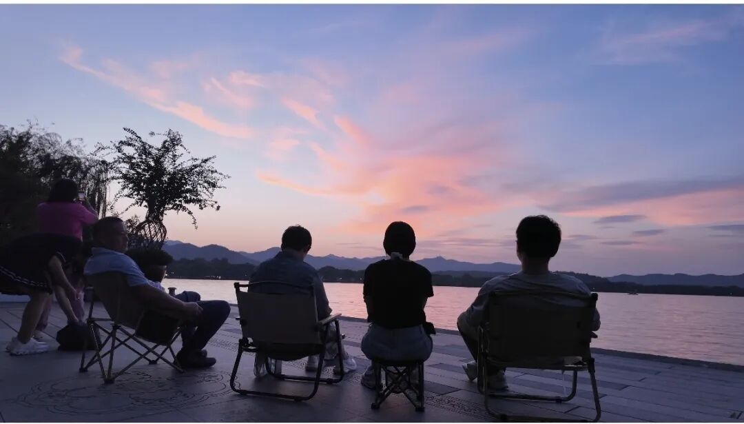 杭州这座美丽的城市,俩人单独去过好几次,体验都很好,这一次刻意选择住在了一家很好的宾馆——比平时出行会选的酒店更贵一些,人少很多,而且拥有一片独享的西湖景观。一个下午,阳光尚好,zengyuan 预感晚上有晚霞,于是带着家人,在 G20 峰会时电视里出现过的湖边露台,摆开小桌板泡上茶,从四点半一直坐到天黑,安静地看了一场西湖的夕阳。