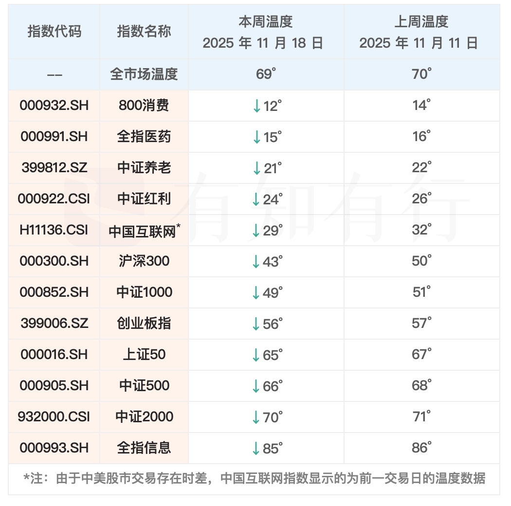 先来看看最近一周的股市表现,从上周三到本周二,A股大部分行业和股票出现回调,港股也是如此,港股跌得更多一些。受此影响,我们的全市场温度降到了 69°。