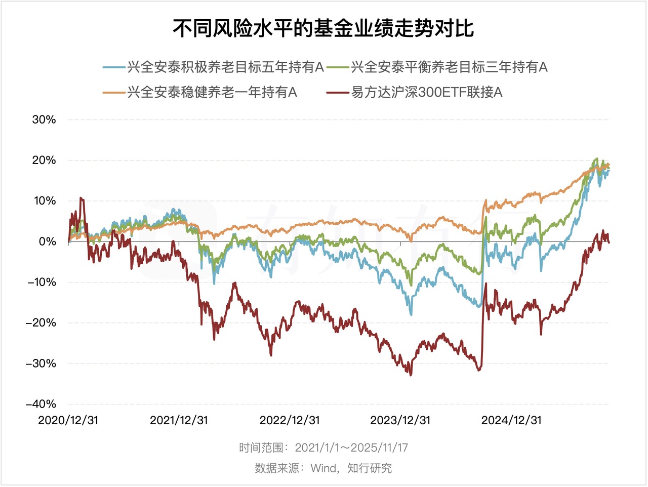 下面这张图展示偏债型(一年持有)、平衡型(三年持有)、偏股型(五年持有)养老目标基金,与沪深300指数基金的业绩走势。