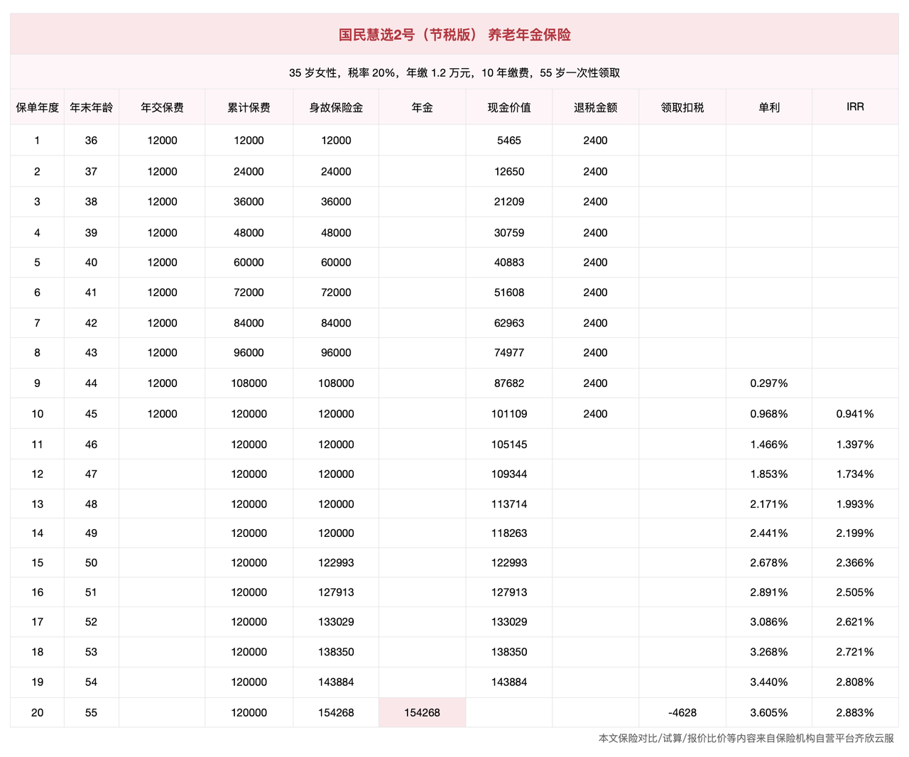 我们以一位 35 岁女性、税率 20%、每年缴 1.2 万元、连续缴 10 年、55 岁开始领取为例,缴费期间,每年可退税 2400 元。