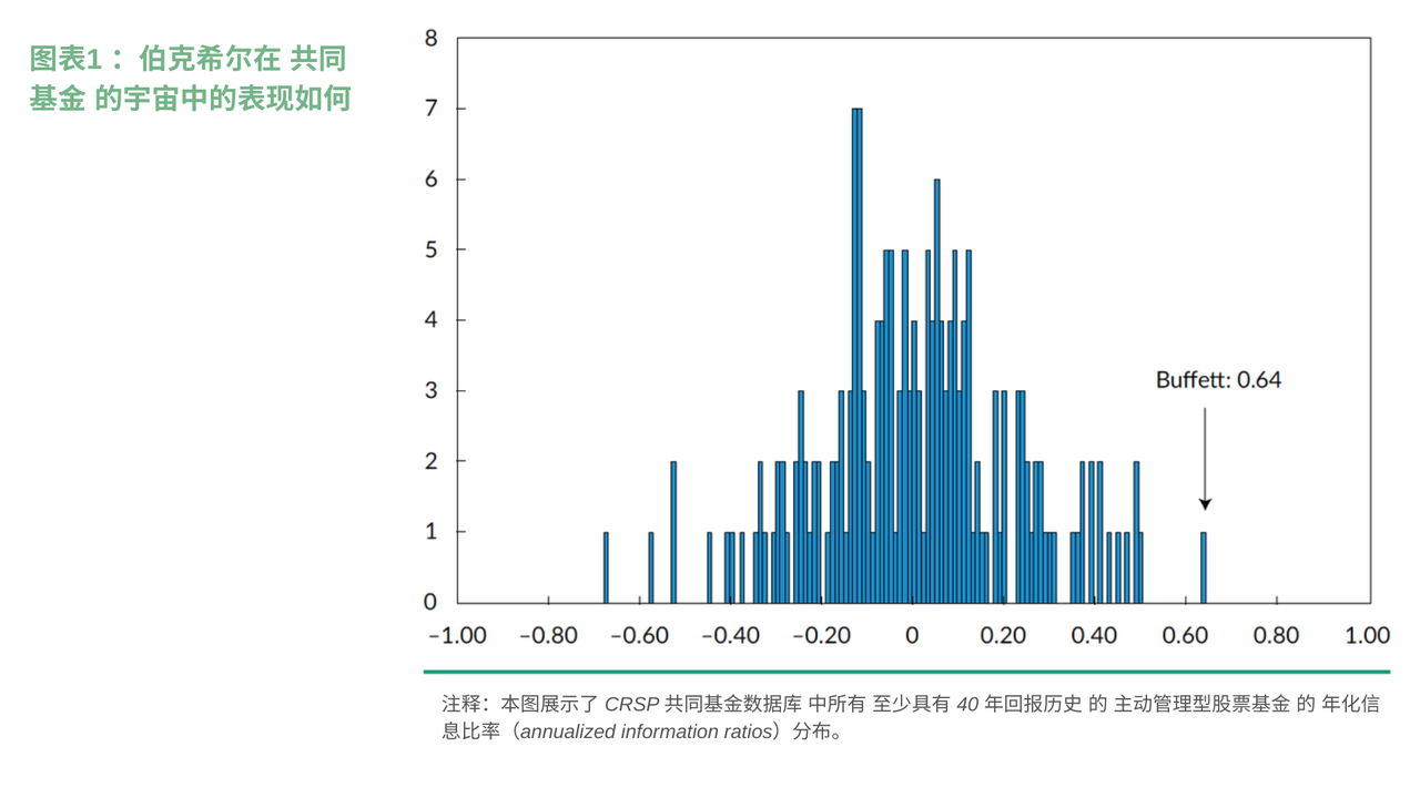 同时,我们还可以从信息比率来更直观地观察伯克希尔的「主动管理」水平。在 1976–2017 年期间,成立超过 40 年的主动股票基金,大部分 年化信息比率 几乎全部集中在 「–0.2 到 +0.2 」区间,这说明多数主动基金的决策,并没有带来持续的超额收益。