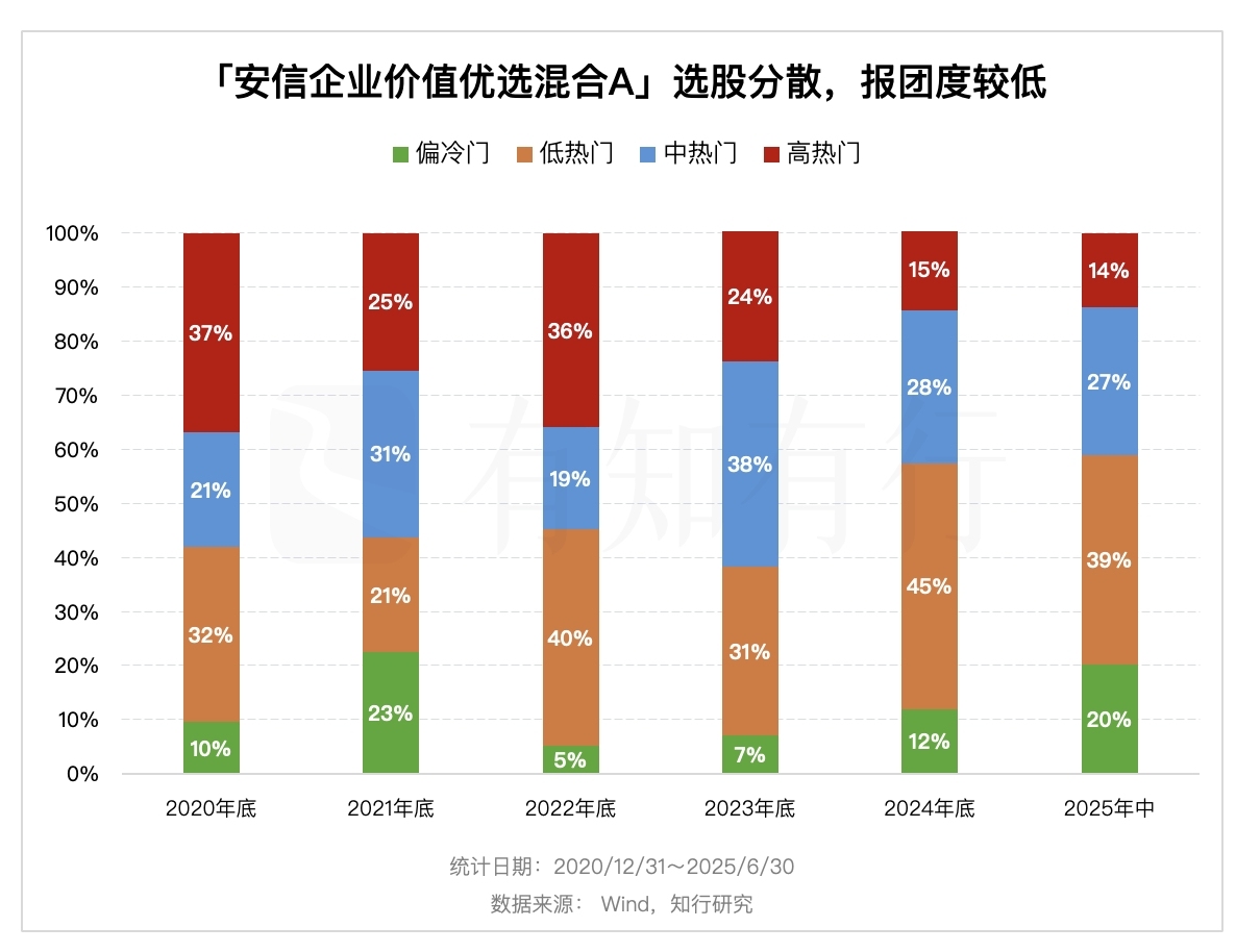 张明的风格稳定性高,长期偏好价值风格,还有一个维度可以说明。下图统计了安信企业价值持仓的股票的抱团情况。国内主动基金经理们很喜欢抱团,抱团一荣俱荣一损俱损,决策压力大大降低。我们对于基金经理的要求是在自己的投资体系下,要有独立思考和决策的能力。