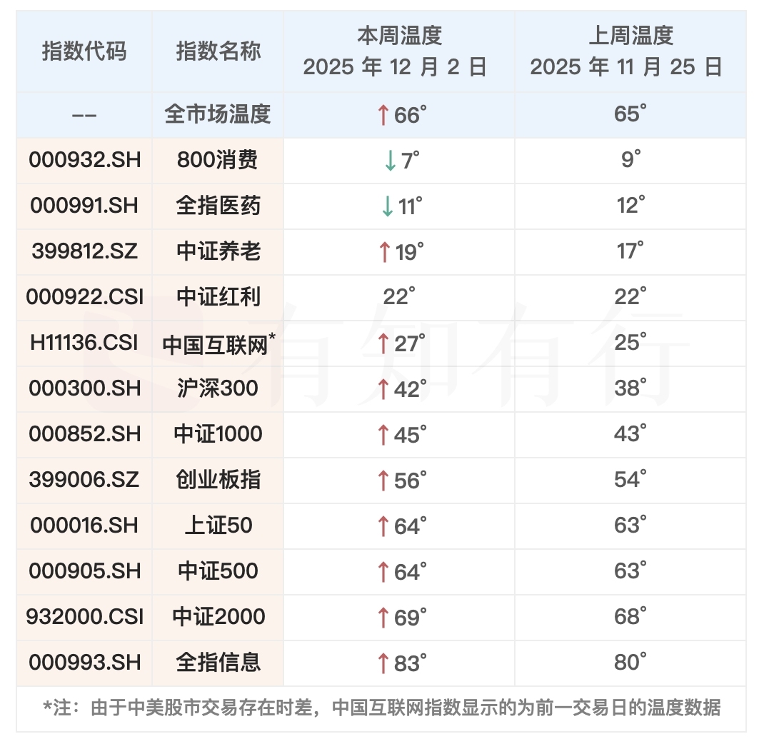 先来看看最近一周的股市表现,从上周三到本周二,A股整体上涨,中证全指上涨 1.31%,大部分行业和个股出现了上涨,受此影响,我们最新的全市场温度是 66°,与上周二相比,小幅提升。