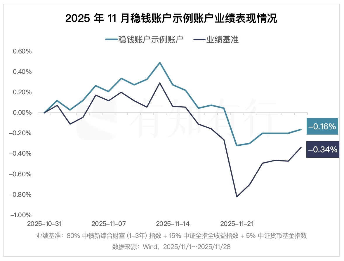 在债券横盘、股市下跌的市场背景下,稳钱账户示例账户在 11 月下跌了 0.16%(扣费后),同期业绩基准下跌了 0.34%,相比业绩基准,稳钱账户小幅跑赢,同时整体波动也比业绩基准要小。