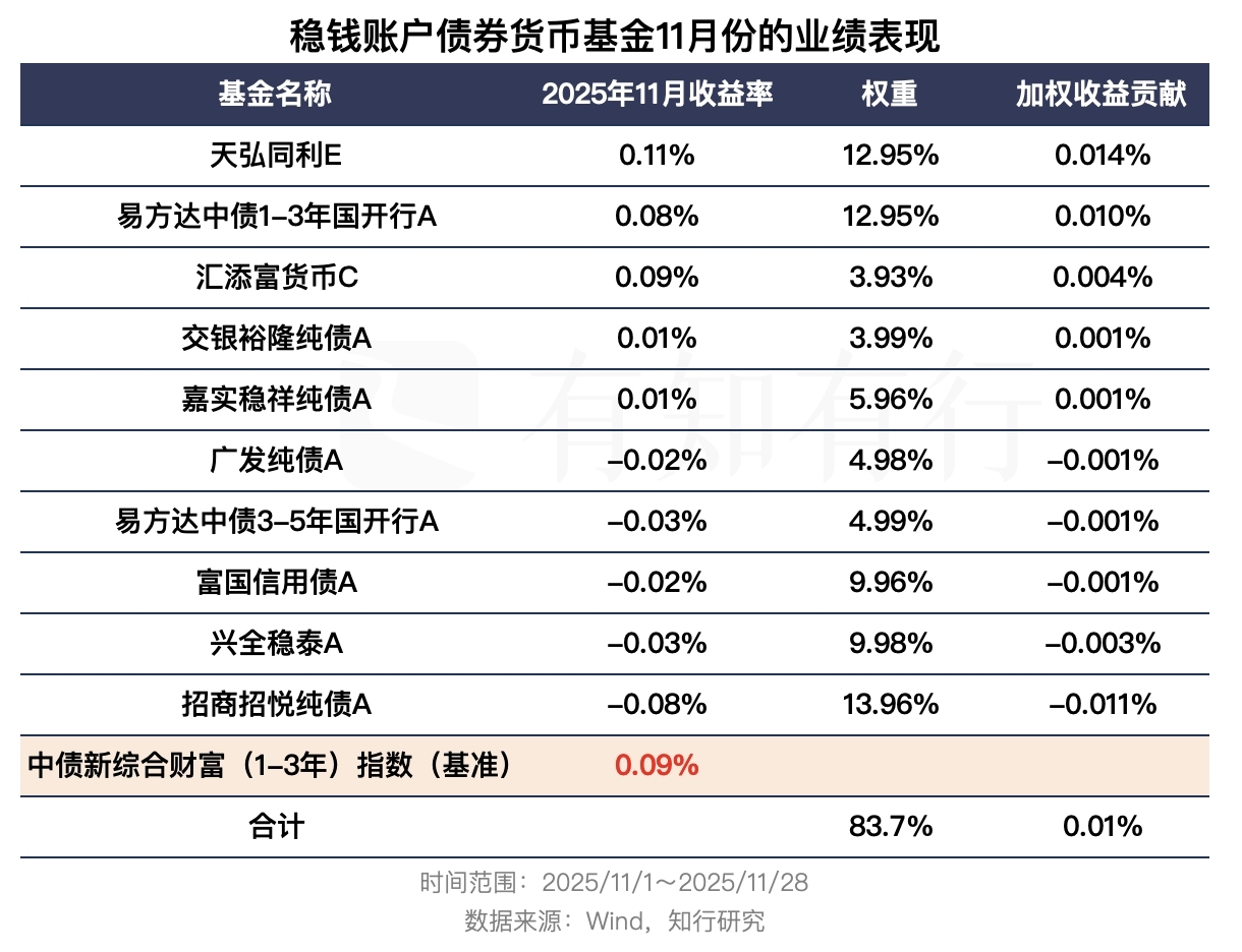 从具体基金上,我们能看到,相比于业绩基准里的债券指数「中债新综合财富(1-3 年)指数」 11 月上涨 0.09%,稳钱账户持仓的债券基金里,只有「天弘同利E」是跑赢的,其他大部分债券基金都是跑输的状态。就像我们前面介绍债券指数一样,债券基金彼此业绩差异很小。即便组合持仓的债券基金整体跑输,但从组合整体层面来说仅跑输了 0.06%。