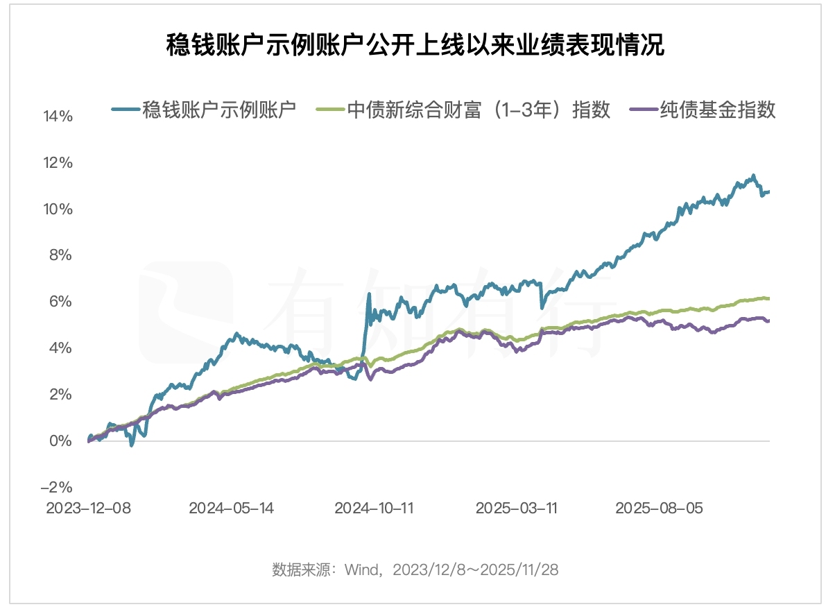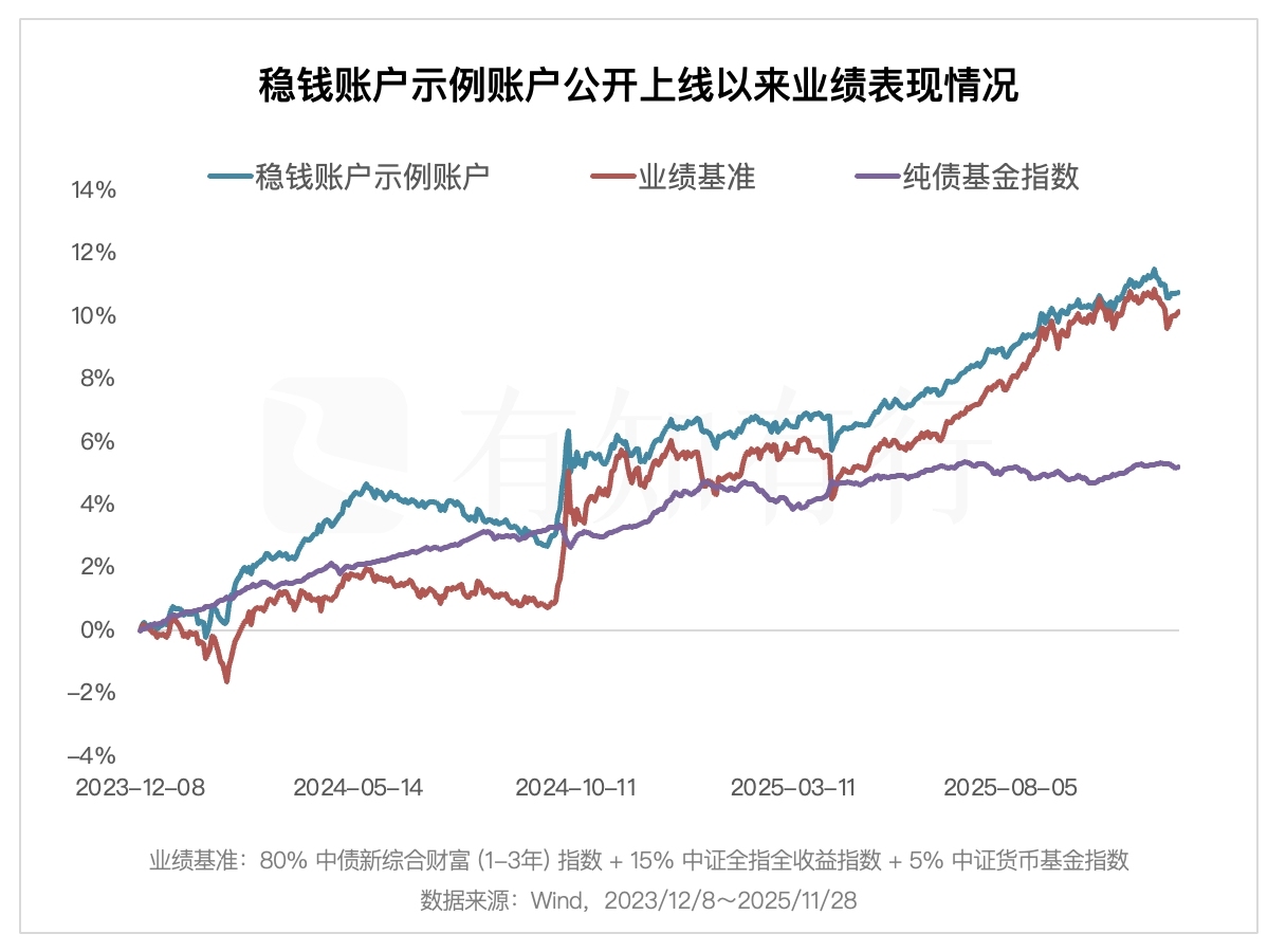 一转眼,2025 年就剩下最后这一个月了。自 2023 年 12 月公开上线以来,稳钱账户即将迎来两岁的生日。截止今年 11 月底,稳钱账户累计收益率达到 10.75%,最大回撤仅有 1.87%。同期业绩基准上涨 10.15%,最大回撤是 2.31%。拆开到单年来看,2024 年稳钱账户上涨 5.87%,业绩基准上涨 4.89%;2025 年至今稳钱账户上涨 3.81%,业绩基准上涨 4.59%。