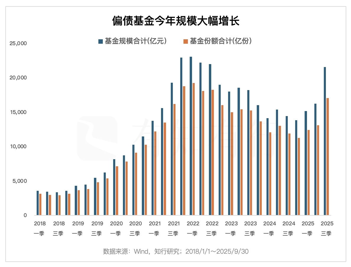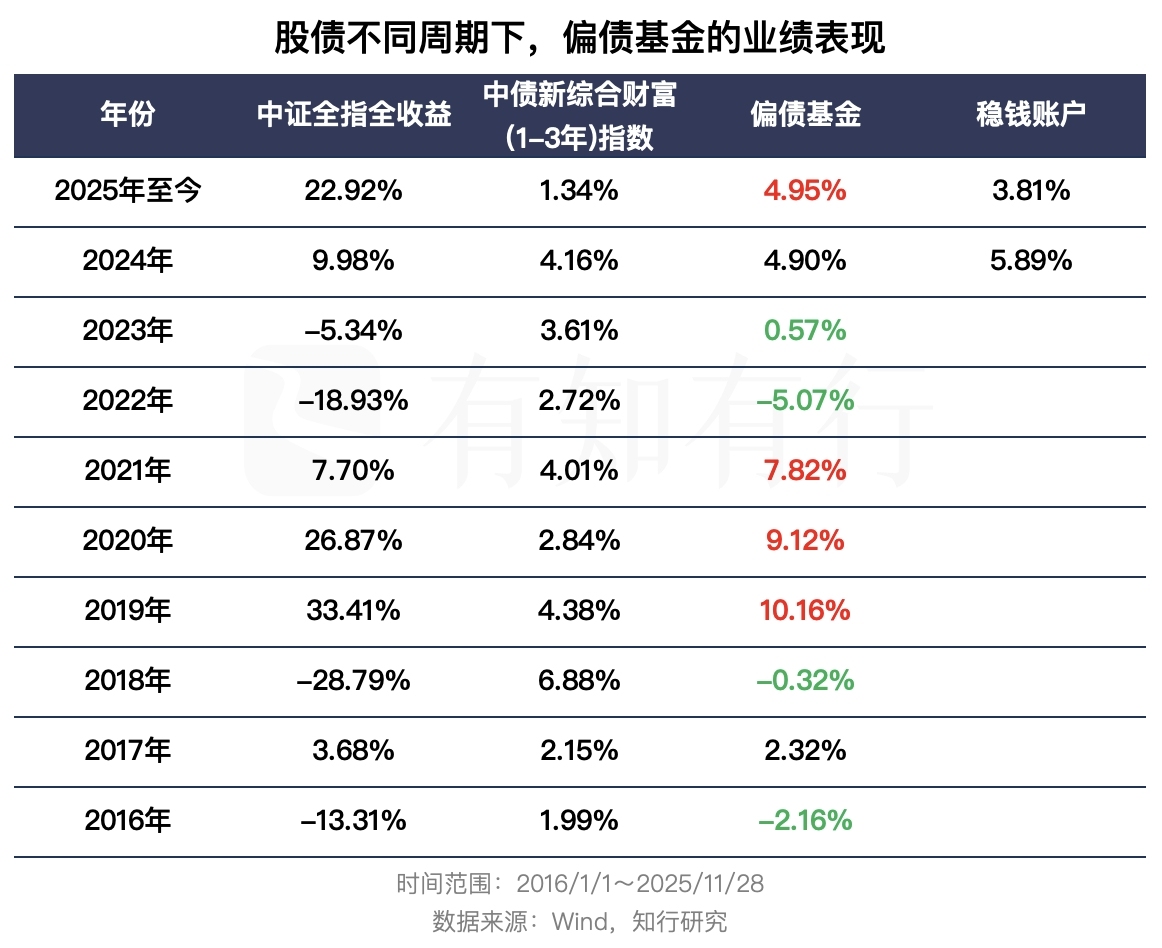 我们把偏债基金每年的业绩表现放在上图中,其中标红的表明这类产品相比于债券资产,获得了更高的收益,标绿的则代表其业绩不如债券资产。标红的年份里,股市大涨出现的频率很高,2019 年、2020 年、2025 年皆是如此。如果当年债市也是牛市的话,那就是偏债基金最喜欢的年份。