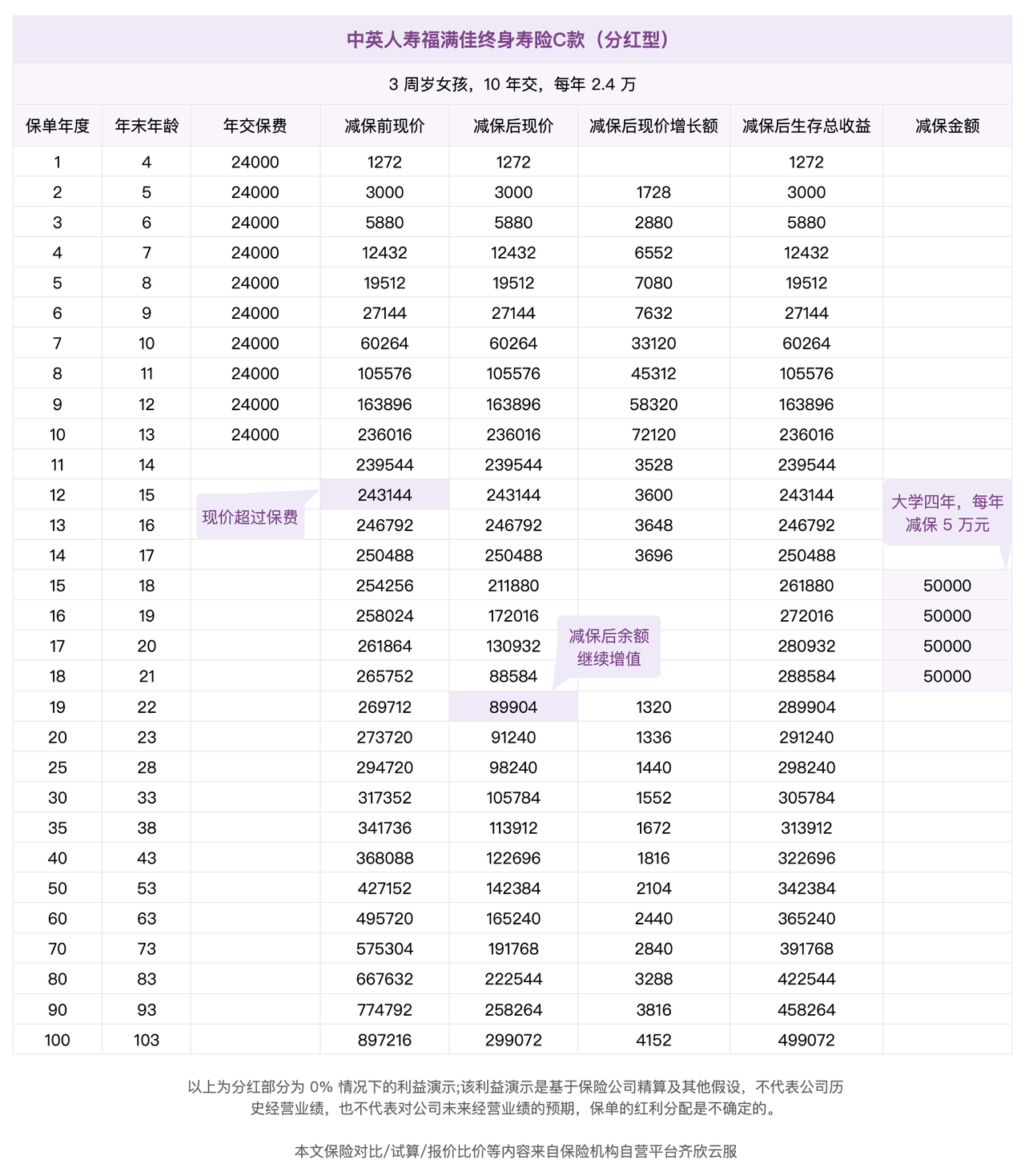 假设没有任何分红,只有保证收益部分,这是这份保单的「底线」。在孩子12岁时,保单的现金价值已经超过了累计的保费,意味着,至少在这个时间点,你可以取回已交的保费。