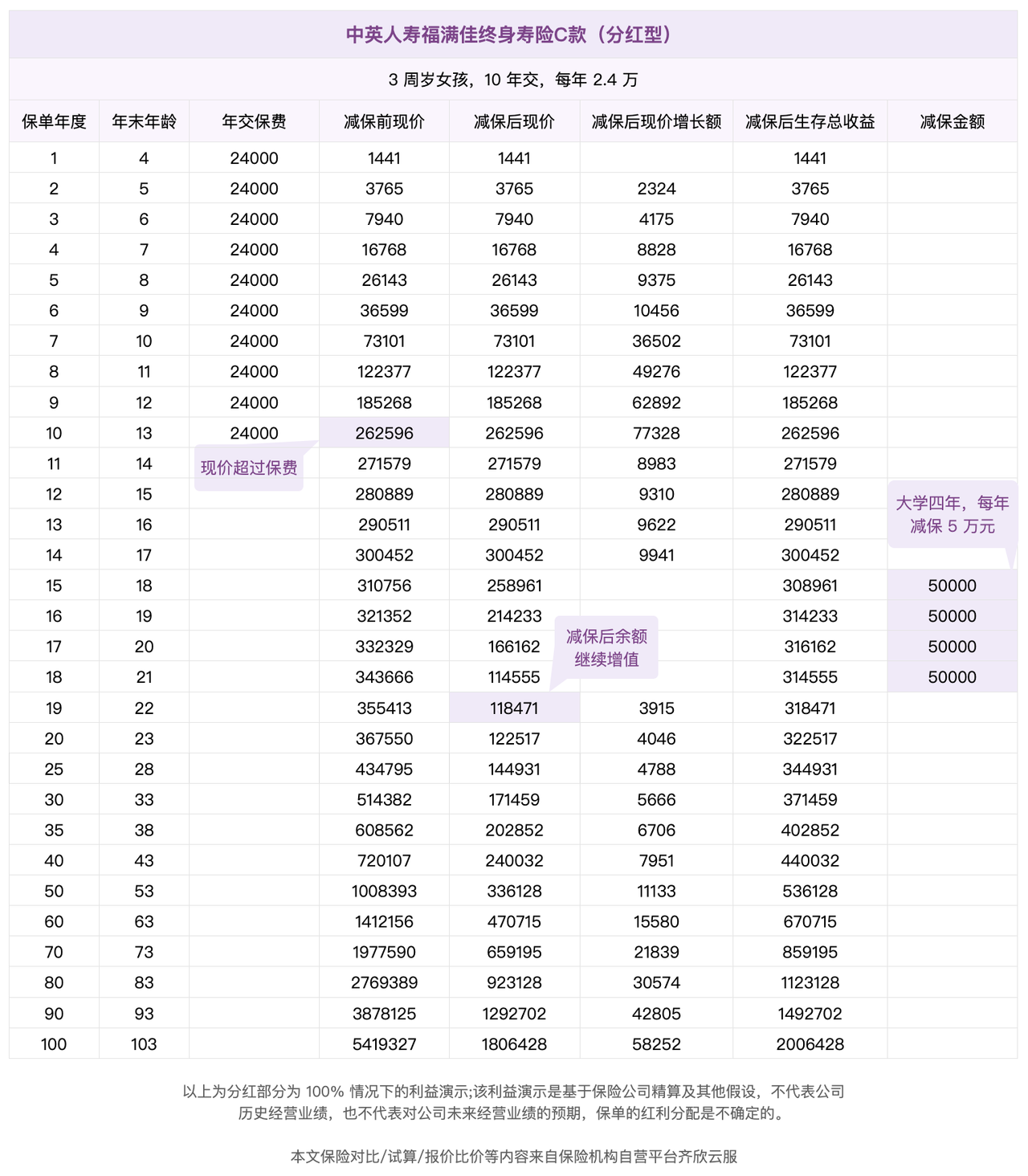 如果分红情况比较乐观,每年都 100% 实现预期的分红收益,18 岁时,保单中将有 31.07 万元。同样假设每年减保 5 万元用于本科费用,到本科毕业时,保单中仍有 11.4 万元余额,继续增值。