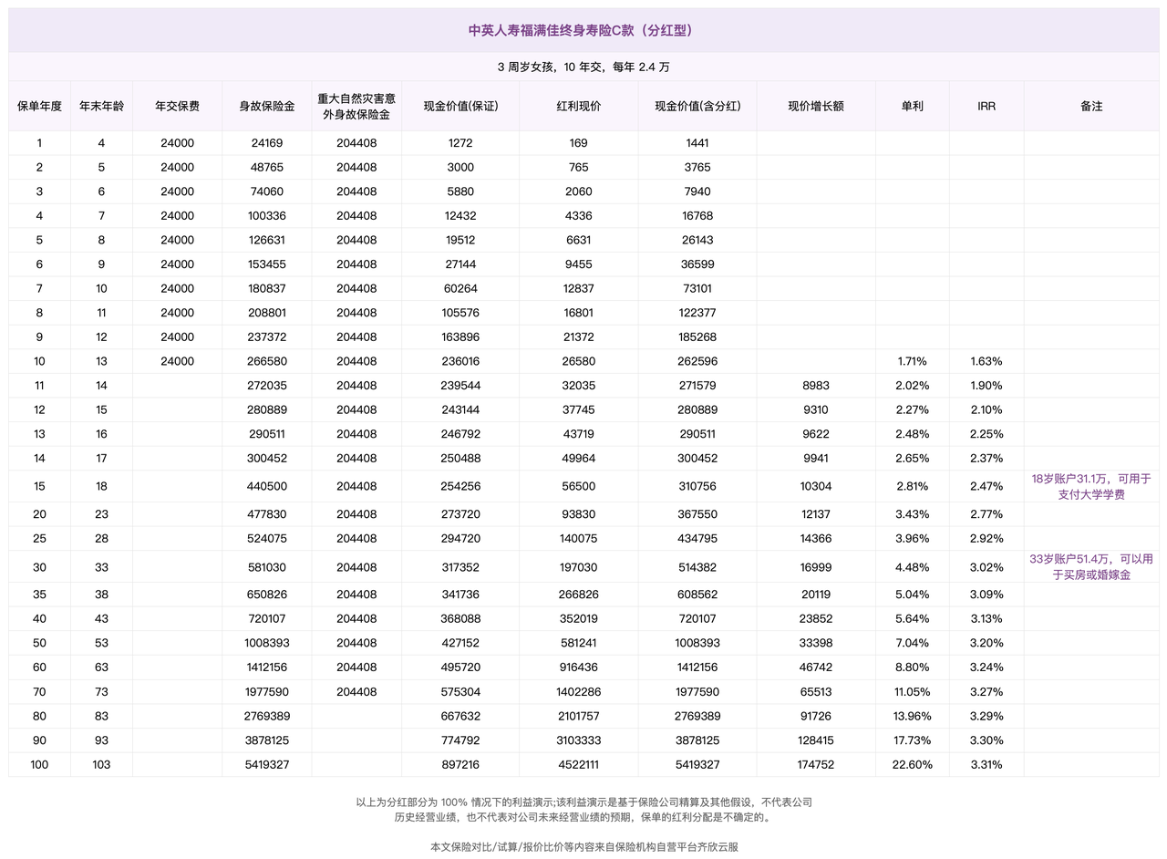 下文,我们以分红型增额终身寿险——中英人寿的福满佳C款为例,来看看这类产品如何帮助我们存这笔钱。