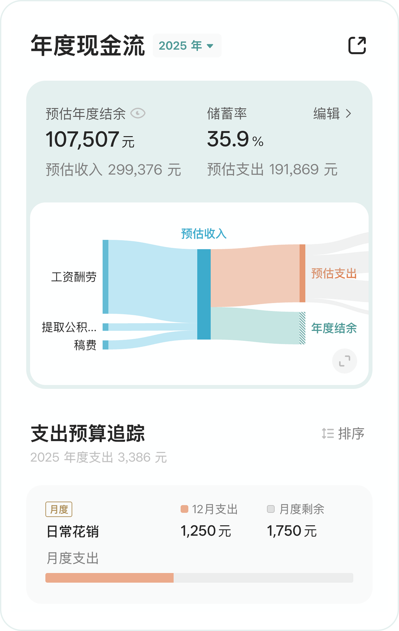 收入和支出预估好后,年度预算也就清晰了,我们在 App 上还可以进行支出预算的跟踪。
