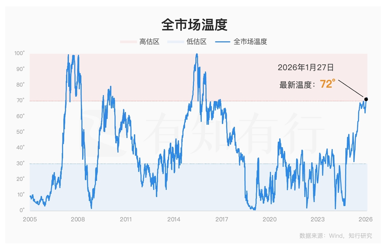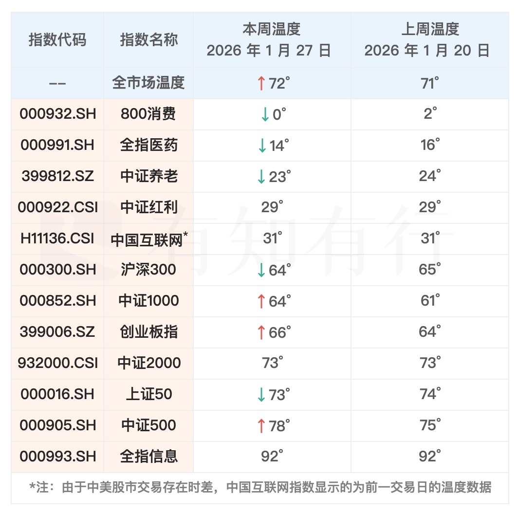 先来看一下最近一周的股市表现,从上周三到本周二,A 股整体上涨,中证全指上涨 1.27%,我们最新的全市场温度是 72°,与上周二相比,小幅提升。