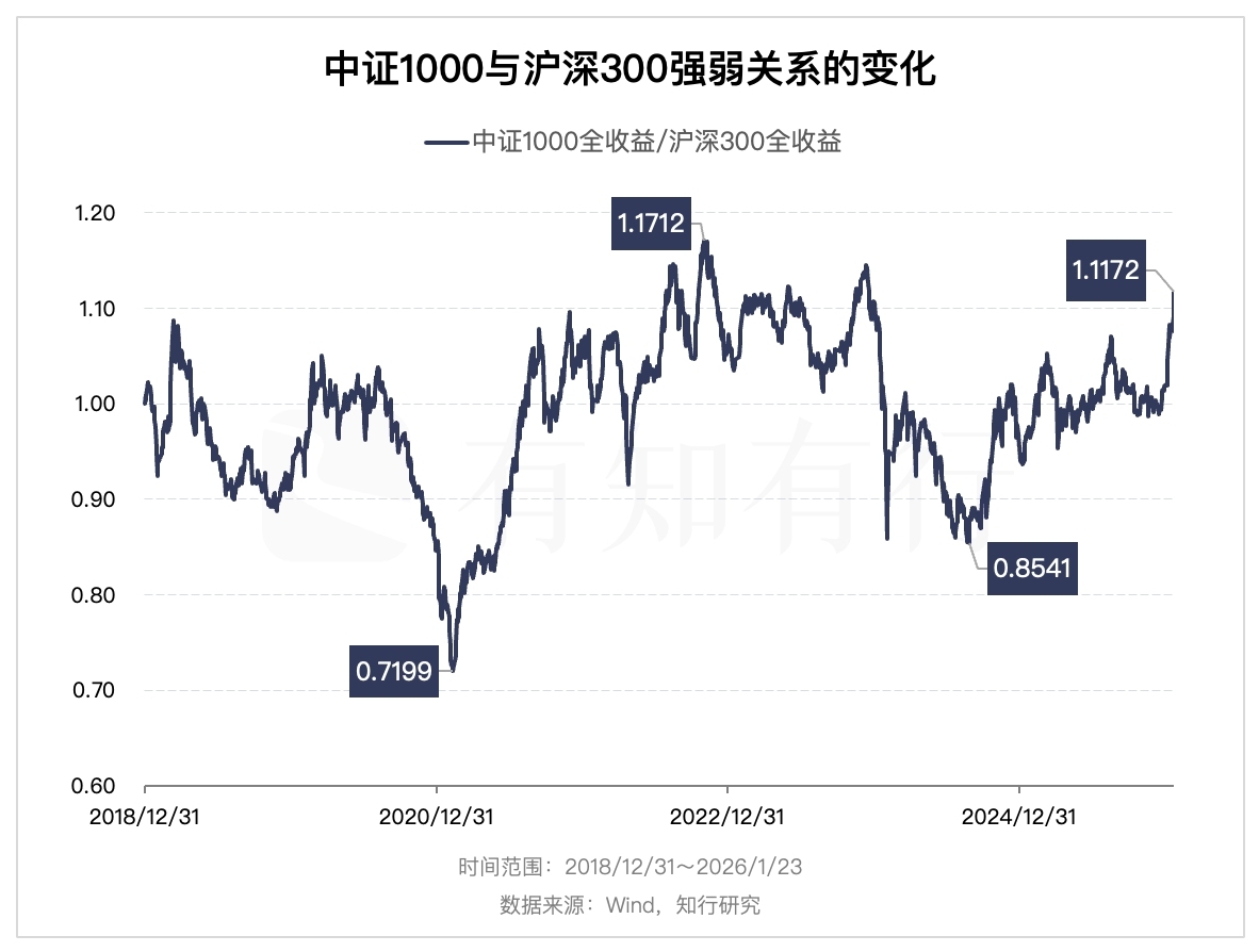 图中是中证1000全收益指数与沪深300全收益收盘价的比值变化。期初归一化为 1,之后随着二者行情的变化,二者的比值会出现上涨和下跌。如果数值持续下跌,意味着中证1000相比于沪深300来说,表现更差,这个阶段大盘股占优,例如 2020 年下半年到 2021 年年初,那一轮是核心资产的牛市,沪深300是上涨的,中证1000是下跌的,中证1000/沪深300的比值快速下跌,最低来到了 0.7199。