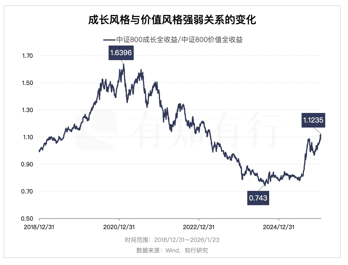 价值风格跑输成长风格,也是近一年多,市场分化的一大特征。中证红利作为典型的价值风格的宽基指数,近一年来表现不佳。为了降低大中小盘风格的干扰,我们仅在中证800成分股里,对比价值风格和成长风格的周期性变化,下图展示了中证800成长全收益指数与中证800价值全收益的比值变化,很明显看出来,成长风格与价值风格的轮动在 A 股非常明显。