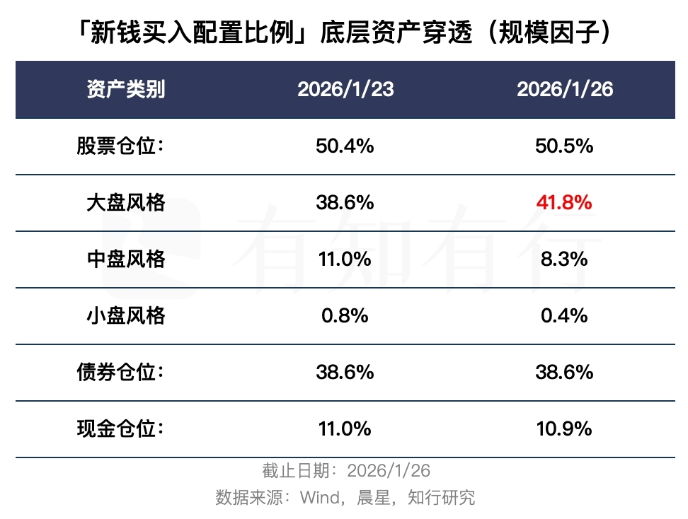整体来看,此次调整之后,长钱账户在配置上仍旧是宽基指数基金为主,行业主题基金为辅。随着中小盘、成长风格大涨,长钱账户在新钱买入配置比例分配上,大盘、价值风格的配置比例有所提升。下面两张图展示了长钱账户「新钱买入配置比例」穿透到底层资产上的具体情况。相比于之前,长钱账户越来越偏向于大盘价值风格。