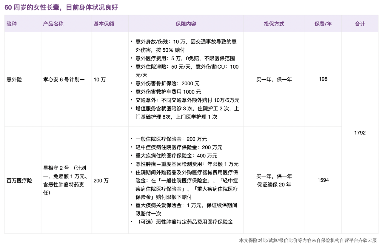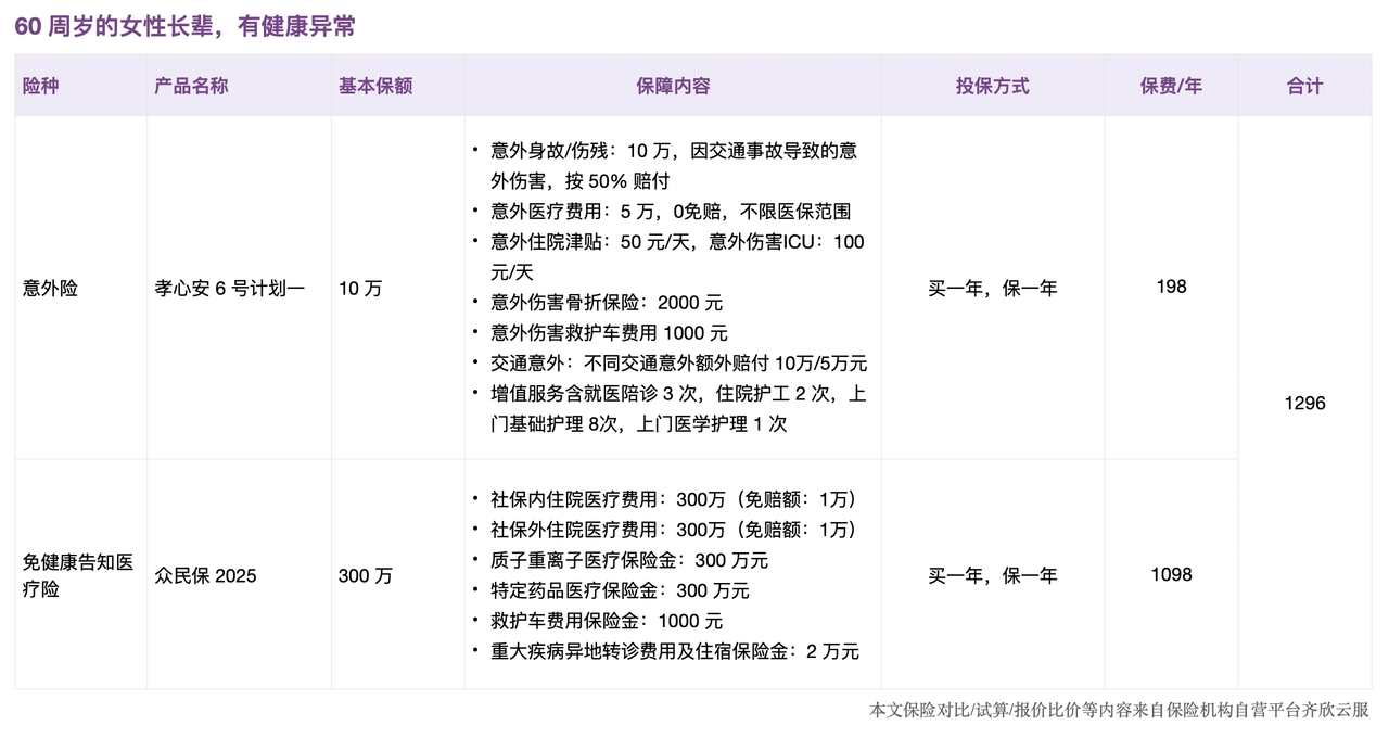 以60岁女性长辈为例,我们展示了完备保障(身体健康、有健康异常)和兜底保障,一共三个方案供大家参考。
