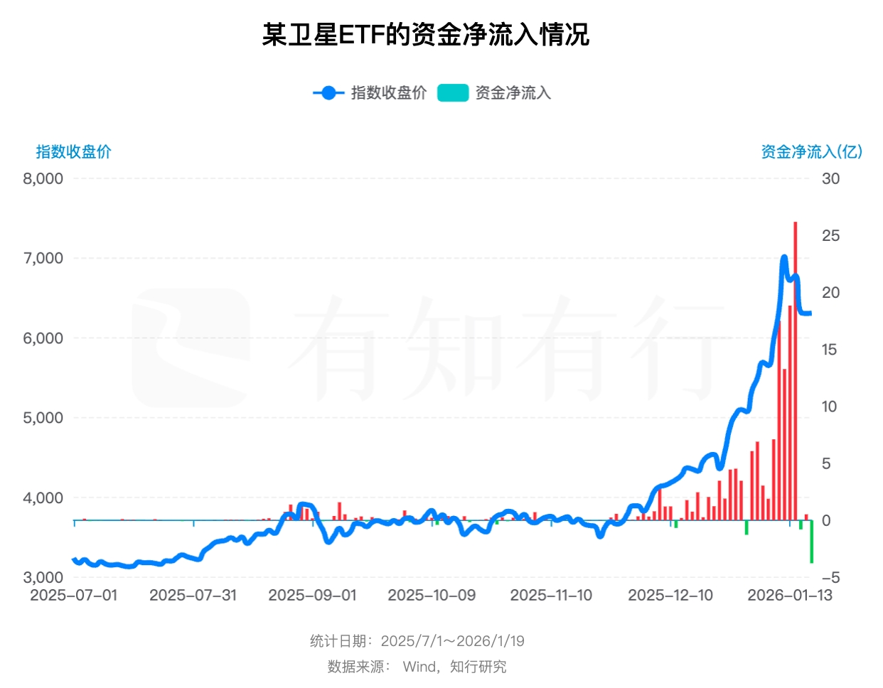 以某卫星 ETF 为例,其跟踪指数在 2025 年 12 月至 2026 年 1 月高点累计上涨约 85%,短期高收益吸引大量资金在高位集中流入。但投资者在行情最热时入场,实际承担了更高的回撤风险。