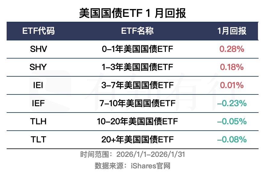 接下来我们看看债券市场方面。2026 年 1 月美债走势有所分化。下图展示了不同期限美债 ETF 的业绩表现。短久期的0-1年美国国债ETF和1-3年美国国债ETF在 1 月小幅上涨,其他中长久期的美债 ETF 则都是下跌的,7-10年美国国债ETF跌幅最大。