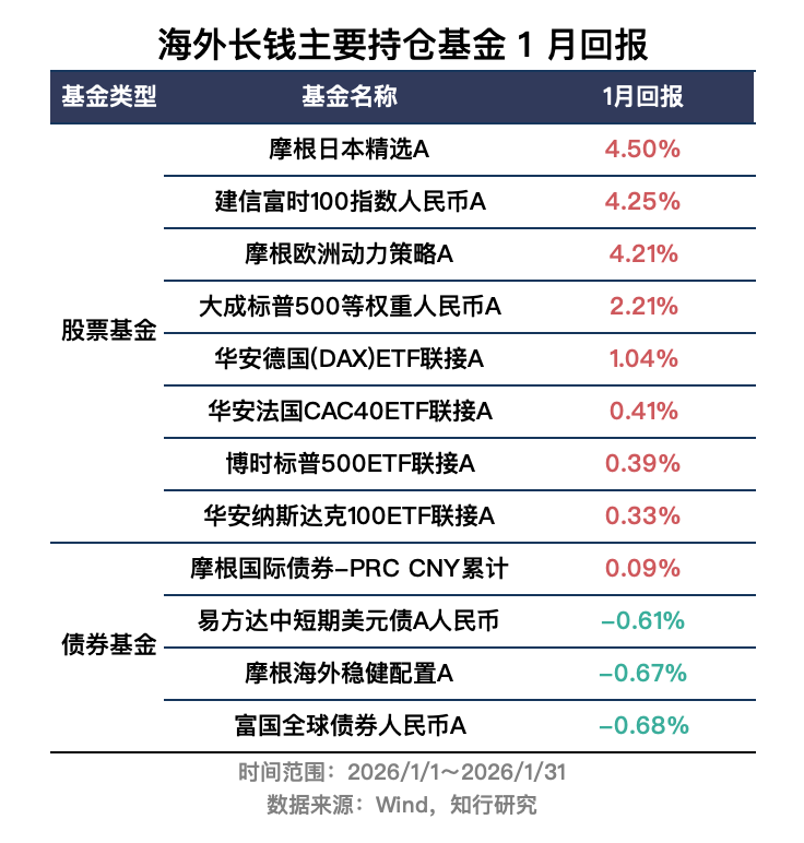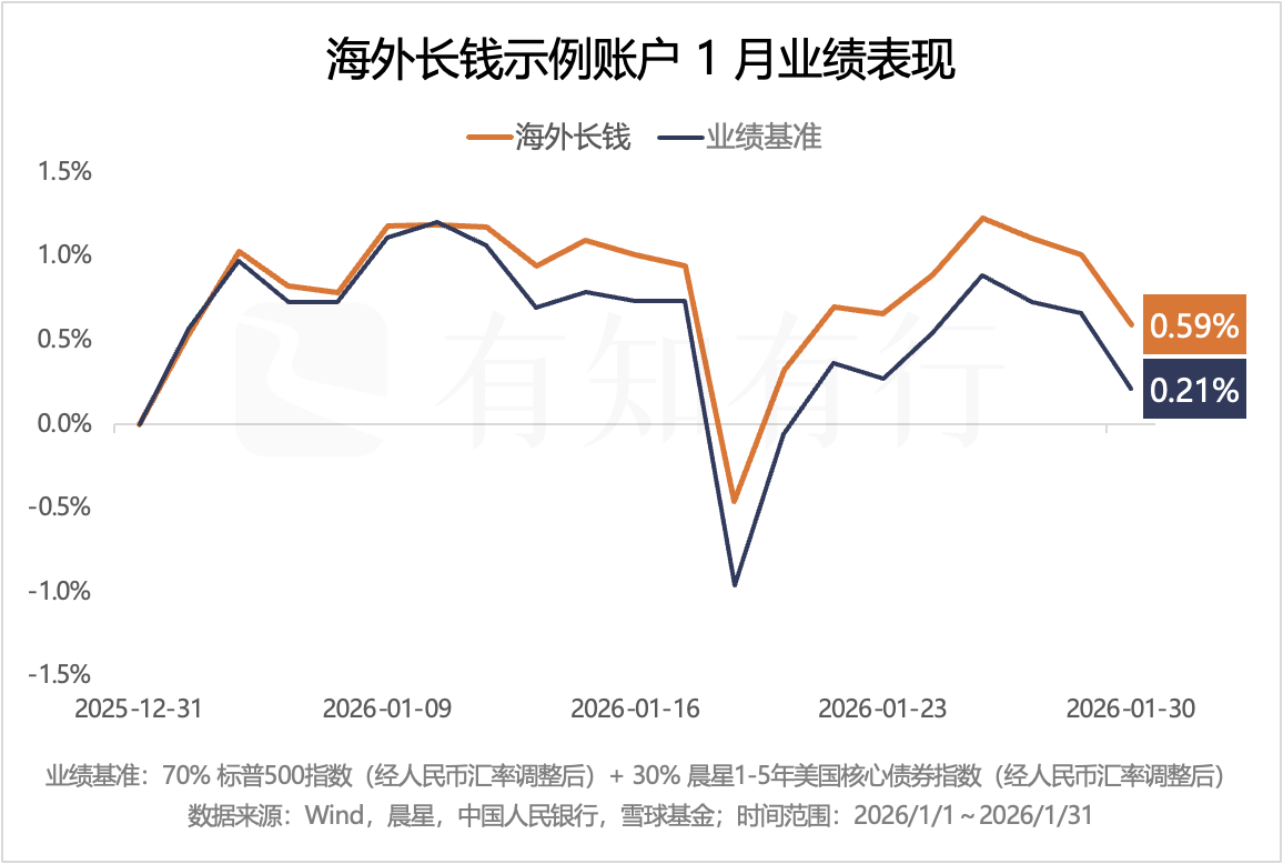综合各种影响后,我们看到 1 月海外长钱示例账户扣费后业绩为 0.59%,业绩基准为 0.21%, 示例账户 1 月出现上涨,且跑赢业绩基准,主要是组合里的日本、欧洲、标普500等权基金的配置带来的贡献。
