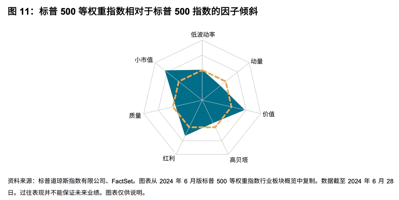 因此,标普500等权指数,是一个相比标普500指数更偏价值和中小盘股的指数。下图是标普官网披露的标普500等权指数相对于标普500指数的因子倾斜。其中黄色的线代表标普500,蓝色的区域代表标普500等权在不同因子上的倾斜情况。从图上我们能看出来,标普500等权在小市值、价值、红利因子上,比标普500要更突出。