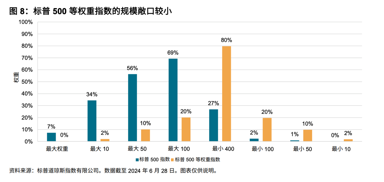 下图展示了标普500和标普500等权指数在 500 只成分股里的权重分布情况。标普500的股票集中度更高,截止到 2024 年 6 月底,前 10 只成分股在指数中的权重合计达到 34%,前 50 只成分股权重合计有 56%,前 100 只成分股的权重合计有 69%。而标普500等权由于赋予 500 只成分股相同的权重,因此只将 20% 的权重分配给前 100 只股票,剩下的 80% 的权重分配给后 400 只股票。这意味着,标普500等权更偏中小盘股。