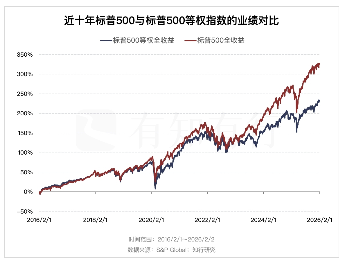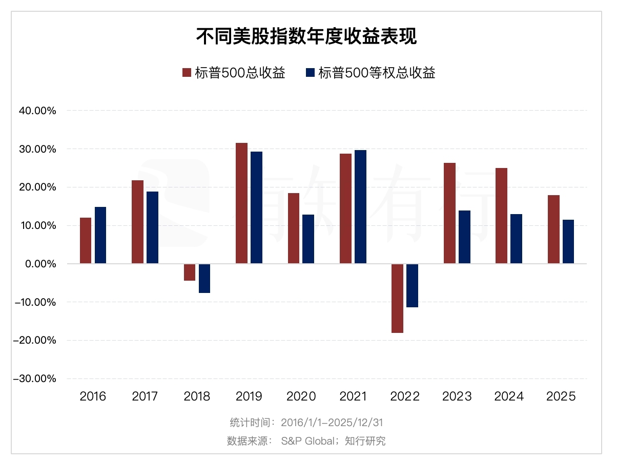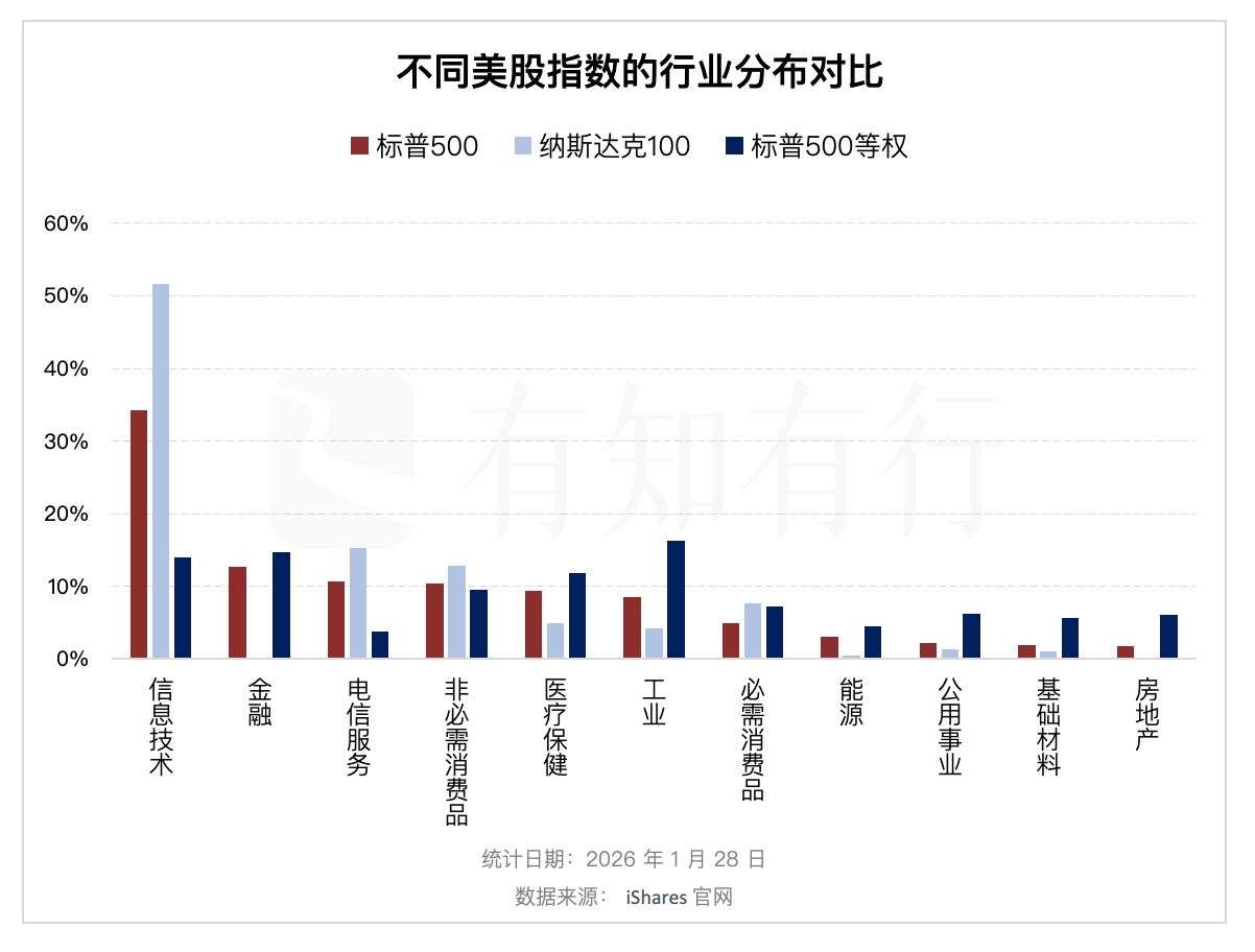 如果大家不了解因子分析的话,我们还可以对比一下标普500和标普500等权的成分股分布和行业分布情况。