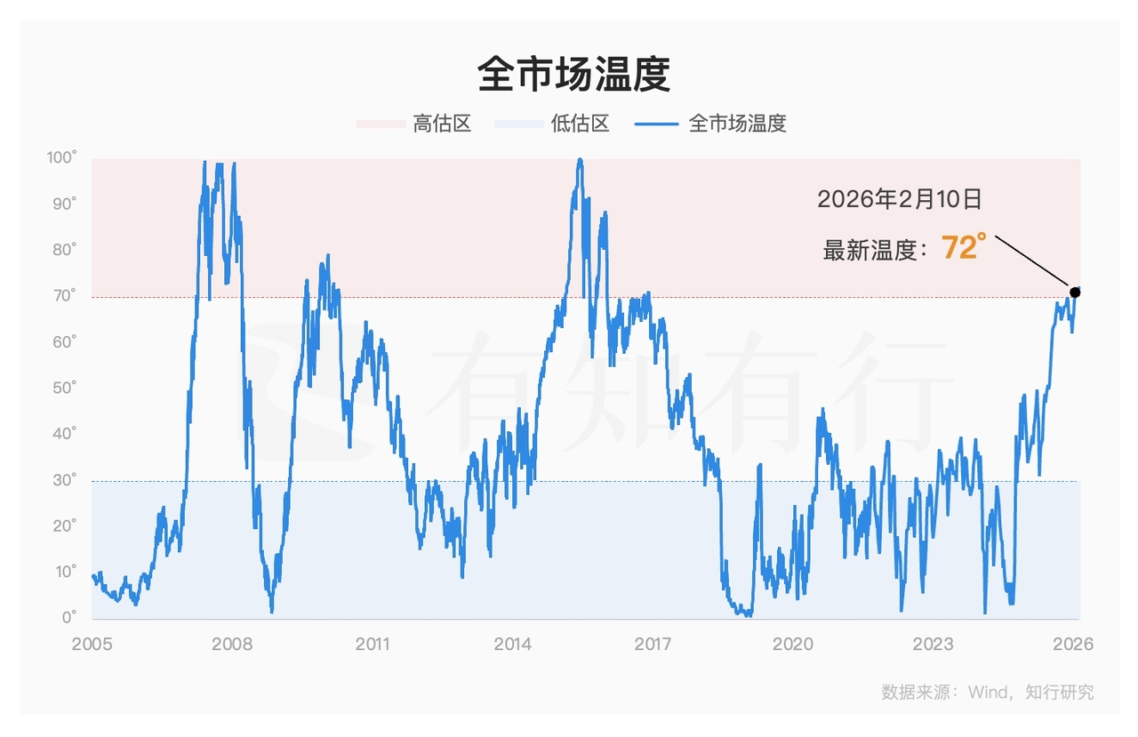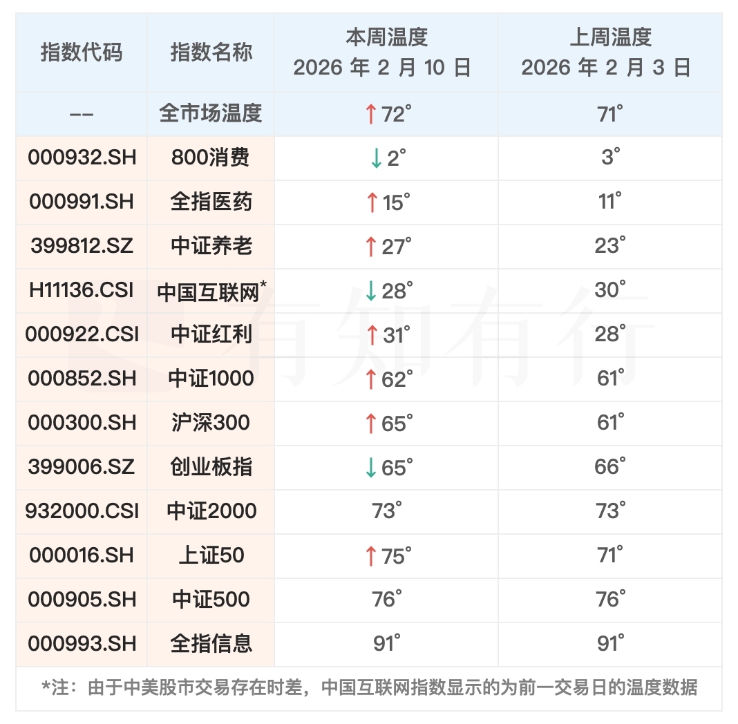 先来看最近一周的股市表现。从上周三到本周二,A 股整体上涨,中证全指上涨 1.06%,我们最新的全市场温度来到了 72°。