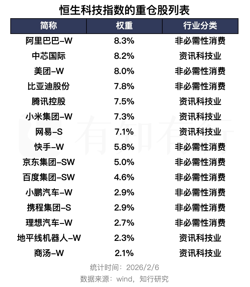 非必需性消费、资讯科技业是恒生指数行业分类的称呼,可以跟大家熟悉的可选消费和信息技术行业做对应。在恒生行业分类里,非必需性消费包括汽车、家电、纺织服饰、旅游及休闲设施、媒体娱乐、教育等支援服务、专业零售等。资讯科技业包括资讯科技器材、软件服务、半导体等。大家可以查看前面恒生科技里重仓股对应的行业来一一体会。
