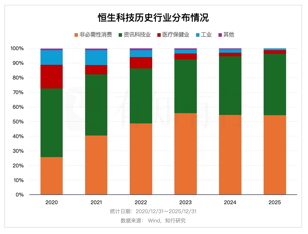 从重仓股我们能看出来,恒生科技即便有个股权重的上限要求,但其持股集中度还是很高的。前十大重仓股在指数里的权重合计高达 69%,前十五大重仓股权重合计高达 82%。从重仓股对应的行业来看,主要集中在非必需性消费、资讯科技业里。下图展示了恒生科技发布以来,每年末的行业分布情况,重仓行业也主要集中在这两个行业。