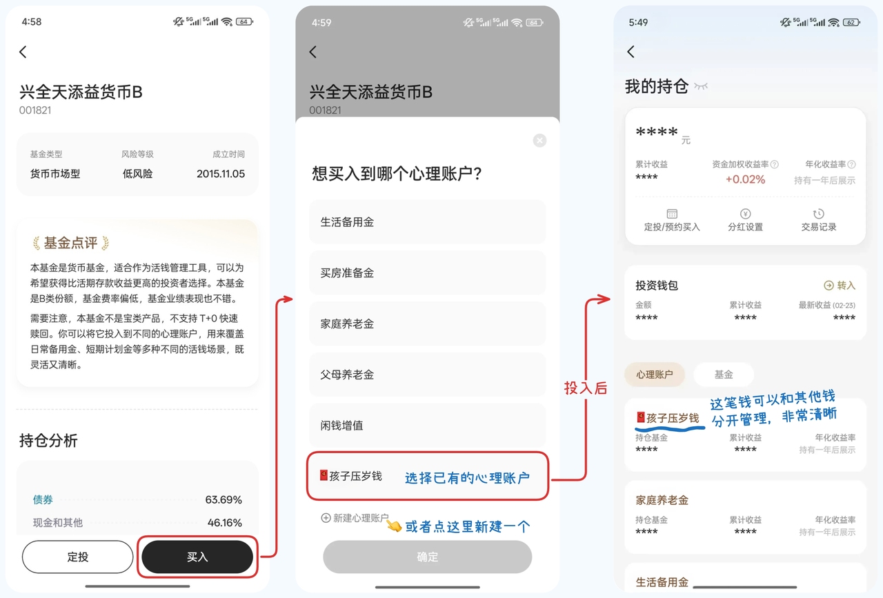我们一直相信「投资是服务于生活的」,所以每次在有知有行点击买入时,都会贴心地多问一句:这笔资金买入哪个心理账户?如果你之前已经给孩子建好了专属账户,直接选它存入就行;如果没有,也可以顺手新建一个。从那以后,孩子的每一笔压岁钱,就都有了清楚的归属地。