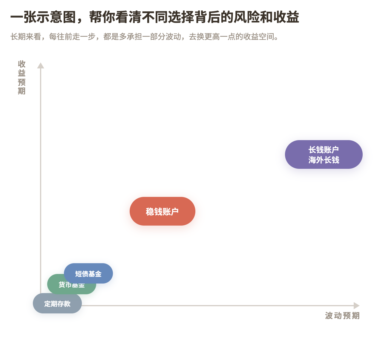 有的人,会停在坐标系的最下边,把钱放在流动性更高、波动更小的地方;也有人,会往前走一两步,在可接受的范围内,去换一点点更高的收益;还有一些人,会再往前一点,用一部分时间,去换一个更有弹性的空间。